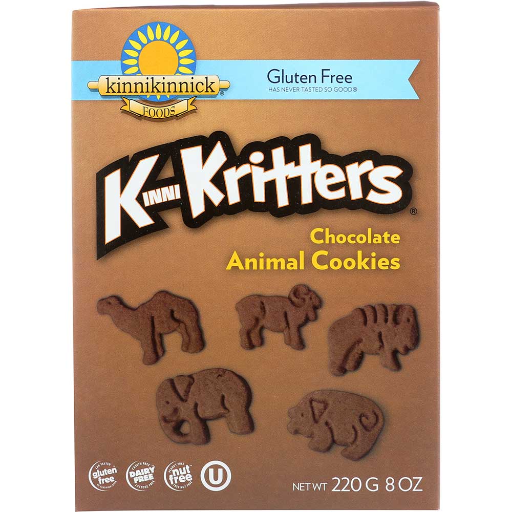 Kinnikinnick foods kinnikritters chocolate animal cookies are our dairy, tree nut, peanut and wheat free treat to you. Our product is made completely gluten-free and lactose-free. Additionally, our cookies are completely Kosher. Gluten-free has never tasted so good. Included is one 220 g. Container of kinnikinnick foods kinnikritters chocolate animal cookies.