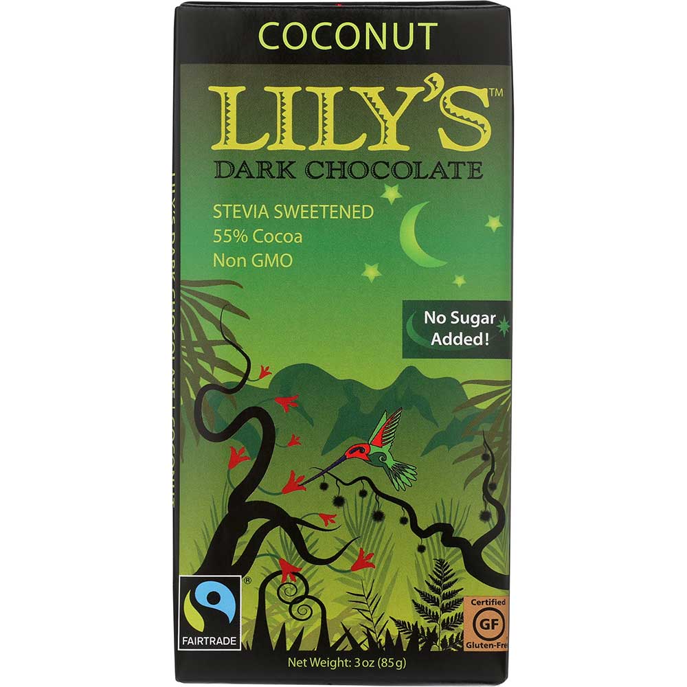Lily's dark chocolate bar, coconut delivers an indulgently rich flavor with 25% fewer calories than the other 55% cocoa chocolate bars out there. Naturally sweetened and gmo-free, this fair trade chocolate tempts your taste buds with the addition of organic coconut and a hint of vanilla. One bar provides two 170-calorie servings. This gluten-free 3 oz. Chocolate bar is individually wrapped and sealed for total freshness.
