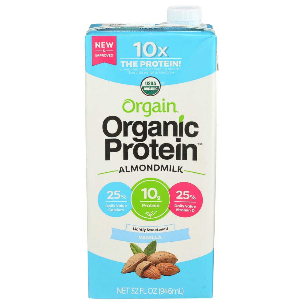 Did You Know That Most Brands Of Almond Milk Are Made Primarily Of Water And Sugar, And Often Contain Just 1g Of Protein. Orgain organic Almond Milk has 10x The Protein Of Most Leading Almond Milks, With 10 Grams Per Serving. it's Also Non-GMO And Made From Almonds Grown On Sustainable, Bee-friendly Farms. It's What Almond Milk Should Be.tm