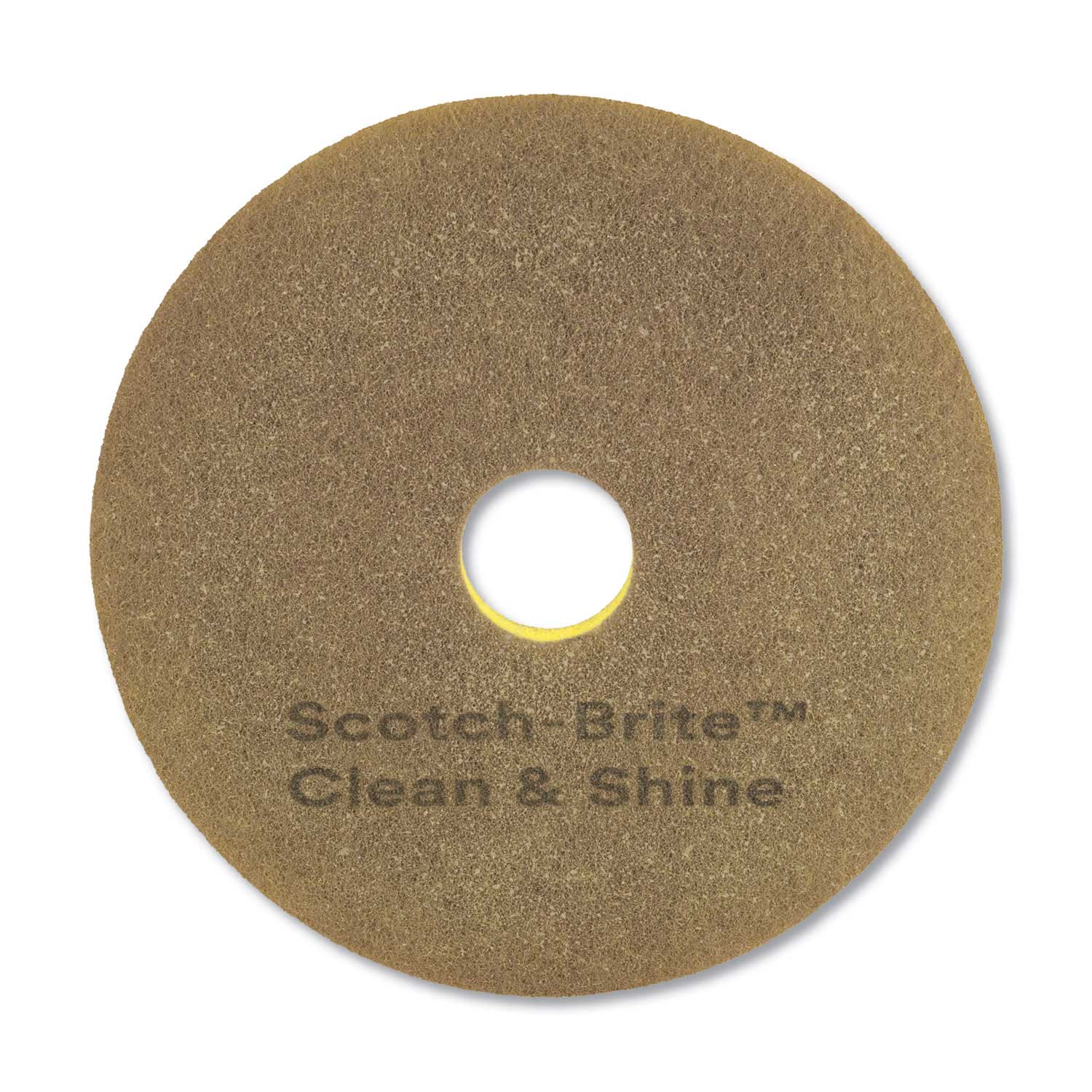 Cleans and shines in the same step, using only a low-speed scrubber. Save costs and labor by reducing or eliminating the need to burnish. Removes black marks three times faster than traditional cleaning pads. Two-sided pad lasts longer than traditional cleaning pads. Effective on most coated and uncoated hard floors including VCT, vinyl, rubber, marble, stone, terrazzo, granite and concrete with only water or neutral cleaner. Application: Cleaning/Polishing; Diameter: 17 ; Color(s): Yellow/Gold; Color Family: Brown.