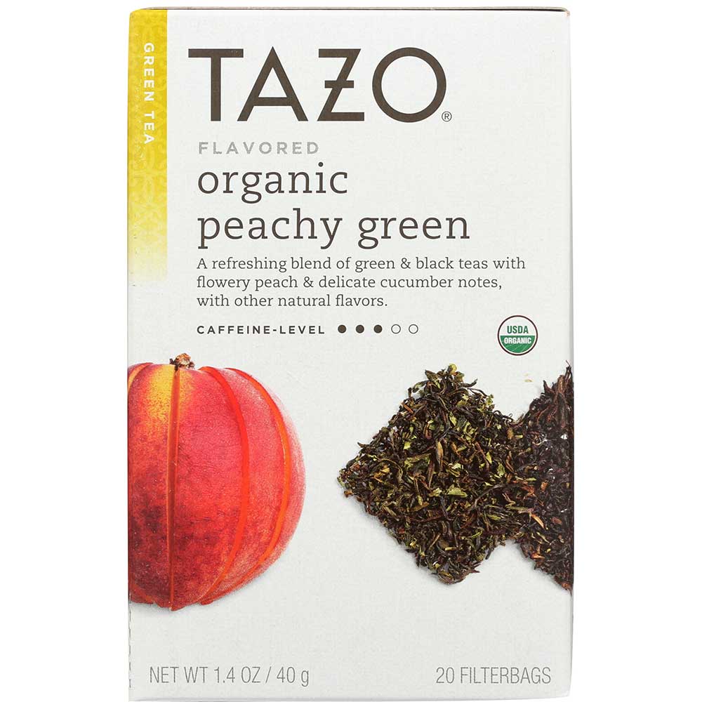 Tazo organic peachy green flavored green tea is a refreshing blend of green and black teas with flowery peach and delicate cucumber notes. Each 8 oz. Serving contains 31-45 mg. Of caffeine with our standard brewing methods. Our floral tea infusion is certified usda organic, non-gmo project verified and flavored naturally, so you can sip blissfully. Includes twenty filterbags of tazo organic peachy green flavored green tea.