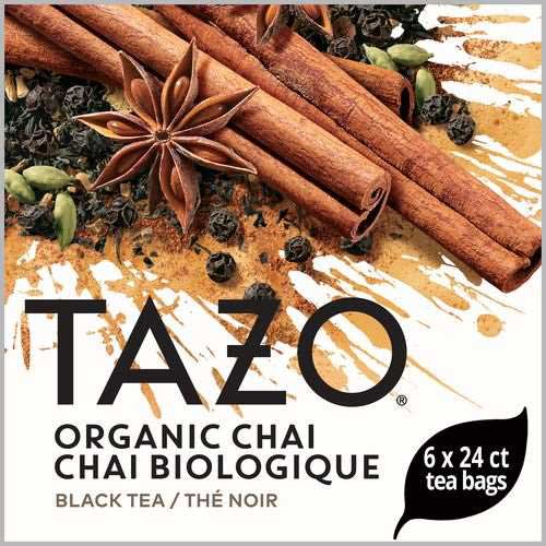 With its imaginative mix of spices. Tazo Organic Chai Tea offers an exciting flavor profile that is certain to please even your most adventurous guests and employees. The USDA-certified organic black tea is fully oxidized to draw out its rich flavor and aroma, and it is blended with cinnamon, cardamom, ginger, black pepper, and cloves for energizing warmth. A twist of star anise brings subtle sweetness. Ideal for restaurants, cafes, hotels, and office environments, this package includes six boxes of 24 individually wrapped bags of Tazo Organic Chai Tea. Whether you're an office manager looking to ignite the creativity of your workforce, or a cafe owner in search of a deliciously unique flavor offering, you will love serving this blend that inspires joy and wonder with every sip.