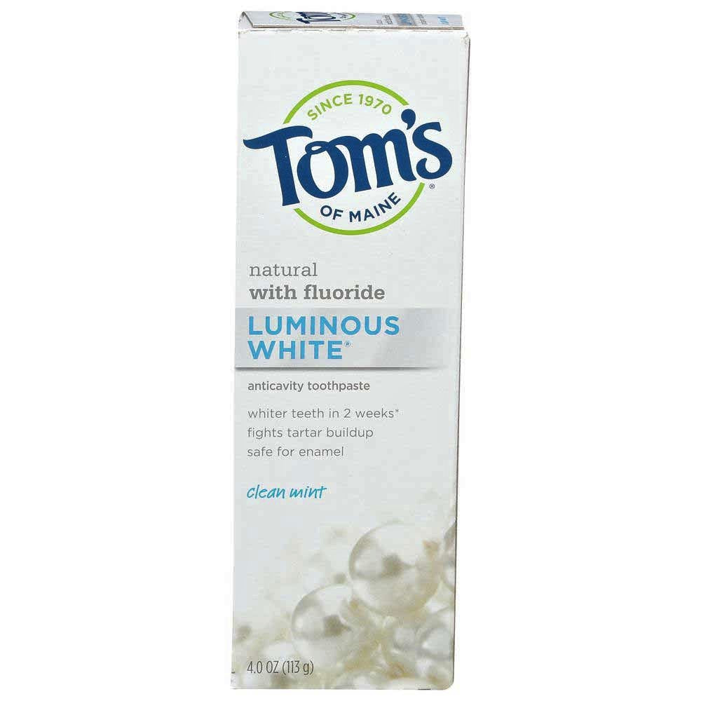 Luminous White Toothpaste in Clean Mint Get whiter teeth in 2 weeks with Toms of Maine Luminous White “ our most advanced whitening toothpaste ever Luminous White toothpaste uses a clinically proven natural whitening technology to remove surface stains that is also safe on enamel and safe for everyday use. Its made with biodegradable or mineral derived ingredients, plus water and contains no artificial flavors, colors or preservatives. by removing surface stains vs regular fluoride toothpaste Gluten free No artificial flavors, colors, or preservatives No animal ingredients Not tested on animals