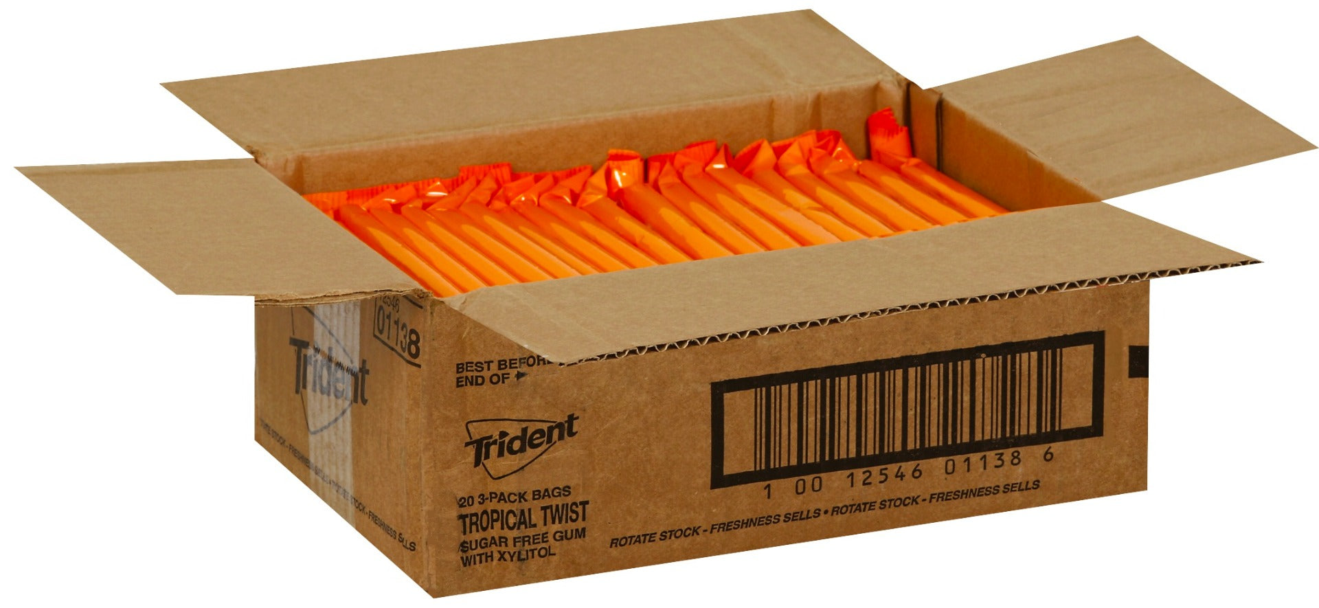 The Trident Tropical Twist Sugar Free Gum cleans and protects the mouth with long-lasting fruity flavor. It is sweetened with xylitol that helps fight plaque. This individually wrapped gum is travel-friendly and great to grab on the go. With 20 packs, the bulk case is ideal for supermarkets, convenience stores, and office cafeterias.
