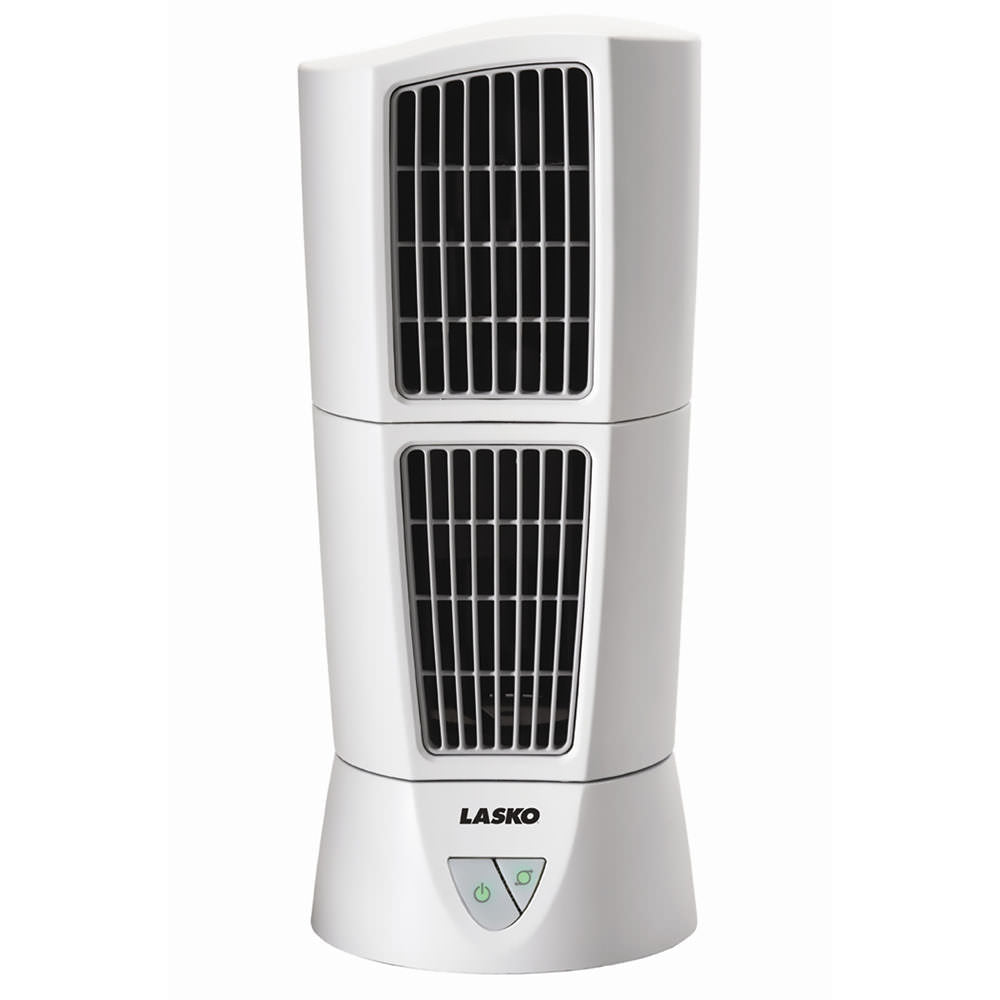 The Lasko 4917 Desktop Wind Tower Fan, in white, is a space-saving desktop fan that has a slim 6-inch diameter. The top module oscillates 45 degrees or can be locked in a fixed position. For precision air delivery pivot and lock the top module so this unit can move the air in two different stationary positions at once. For even greater coverage and versatile air circulation, combine the pivot with oscillation. It is ideal for tabletops, desktops, workshops, health clubs, stores, classrooms, offices, hospitals and other areas where there is limited space. Features include three speeds, front-mounted electronic controls, integrated carry handle and a 120-volt permanently lubricated motor. Its unique look, amazing performance and portability is perfect anywhere you want to keep cool.