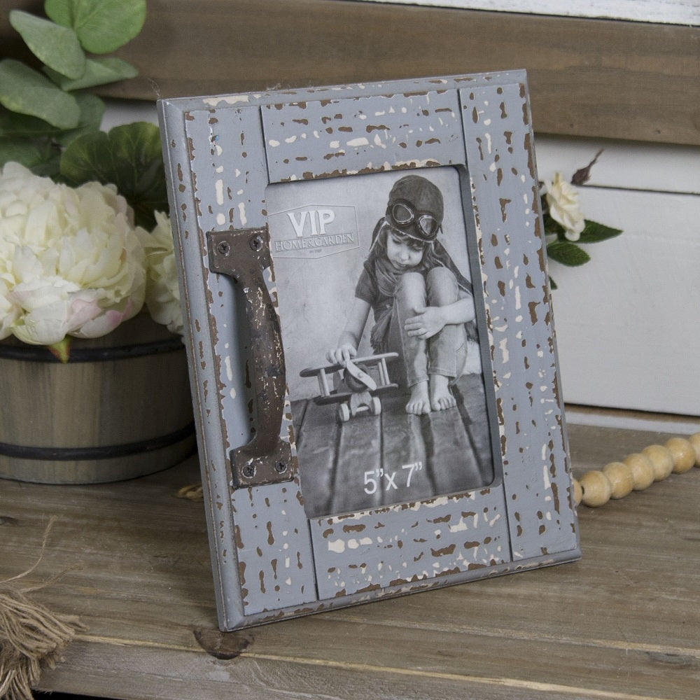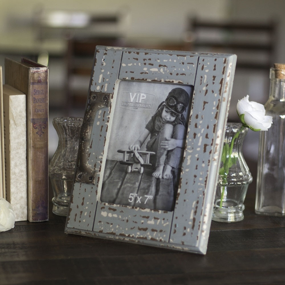 This picture frame is so unique. The blue color, distressed finish, and hardware, give it a rustic feel. This is perfect for displaying family photos.