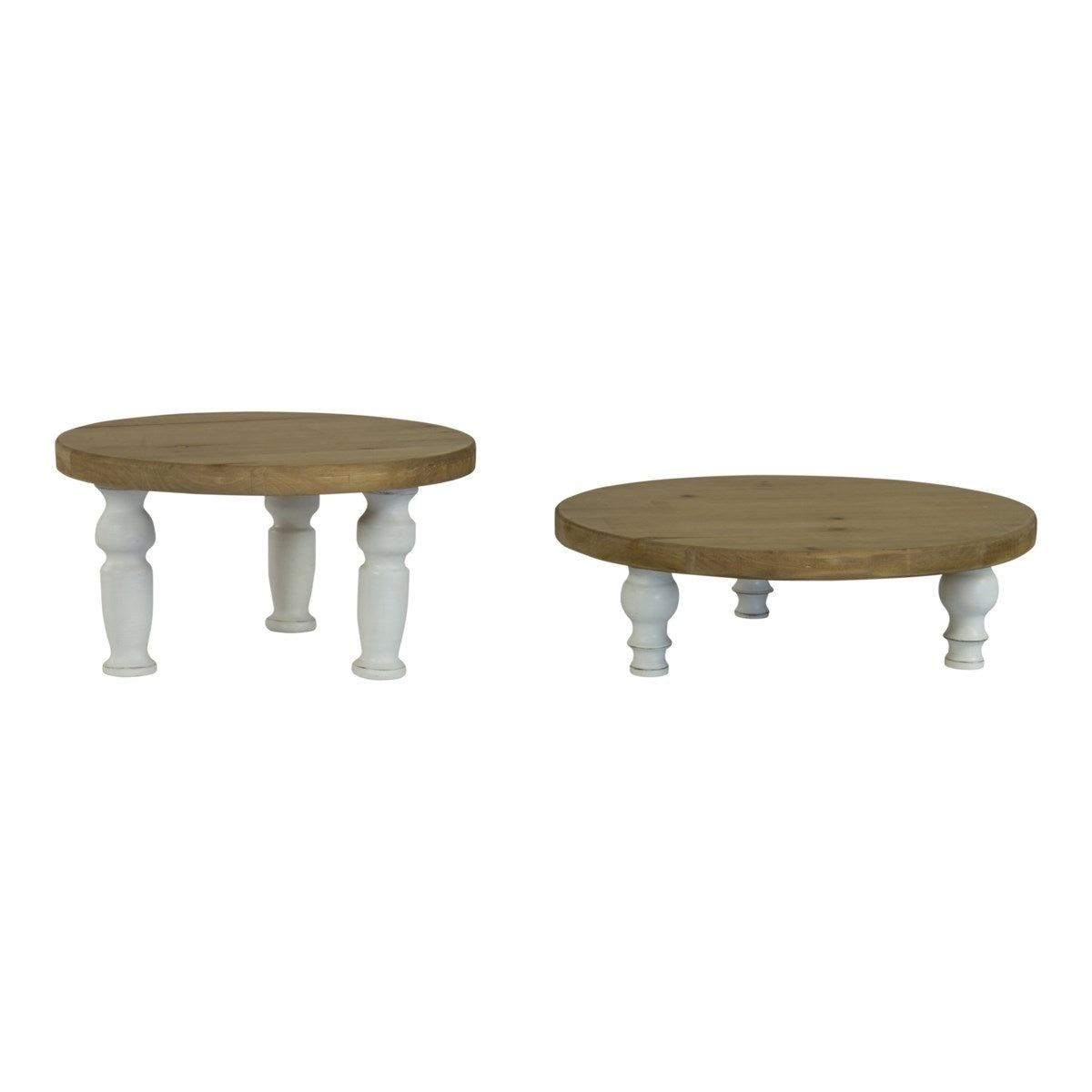 This is a set of 2 risers. They are round, with a wood top, and beautiful white legs. Use them alone, or stacked together. Use in any room of the house.