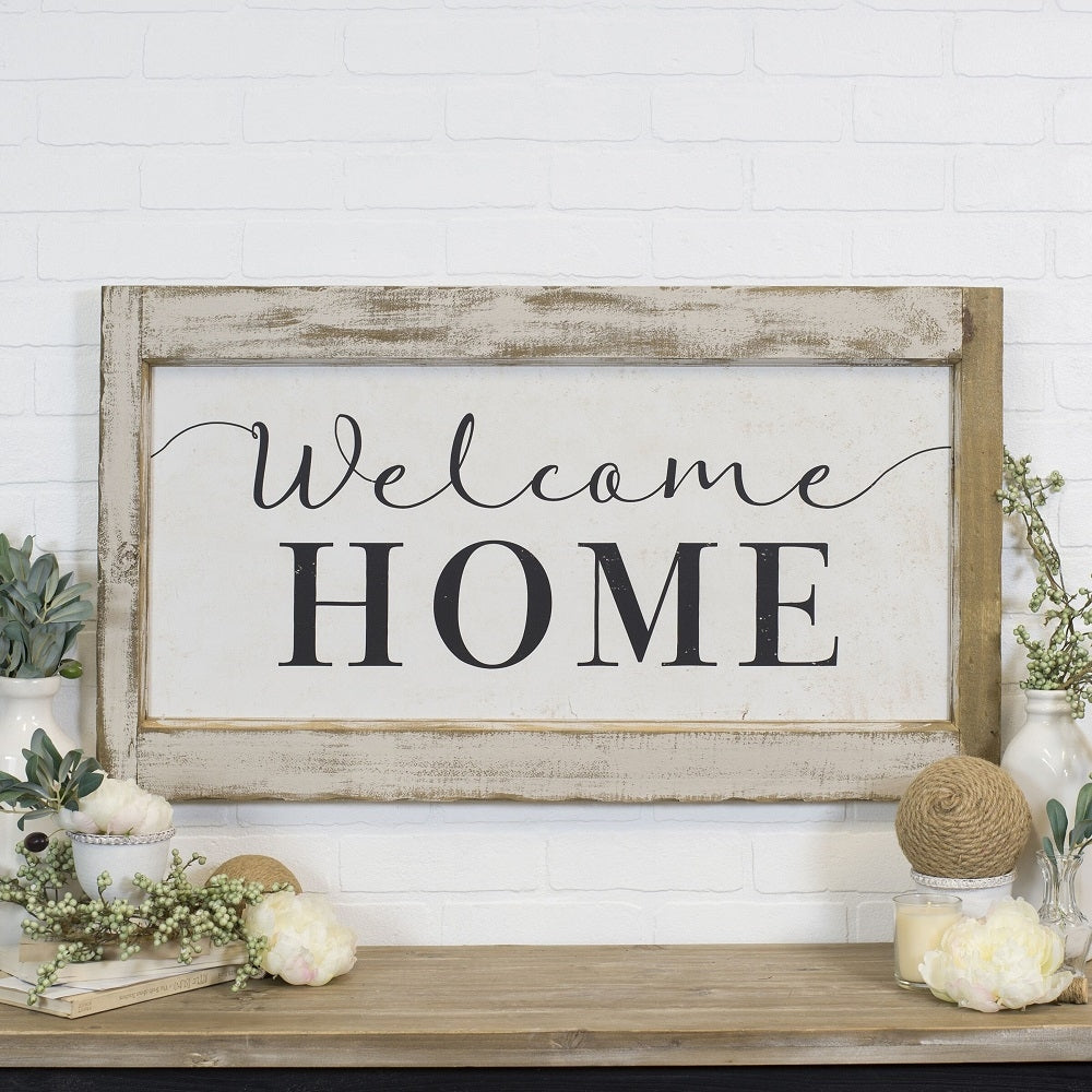 "Welcome Home". This large wood sign makes a huge statement. The sign is painted white and distressed for a rustic look.
