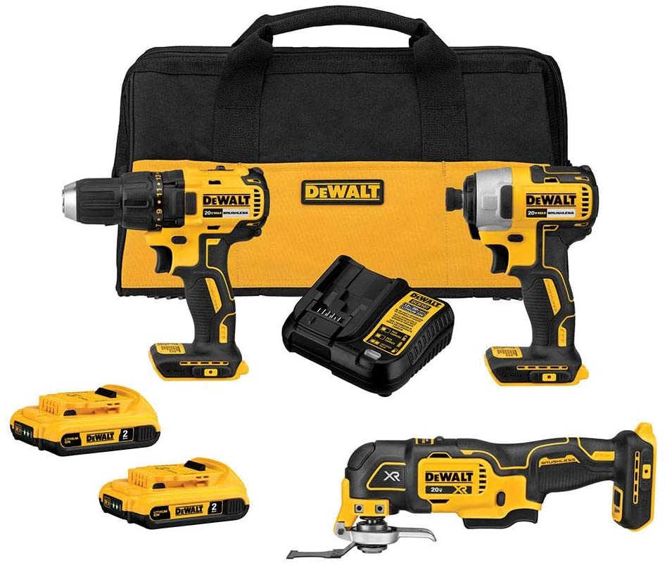 1/2 in. Drill/Driver is only 7.52 in. front to back and has a compact design to fit into tight spaces. 1/4 in. Impact Driver is lightweight at only 2 lbs. Oscillating Multi-Tool has a dual-grip variable-speed trigger that offers increased speed and application control. Oscillating Multi-Tool has 3 bright LEDs to illuminate dark work surfaces. 20V MAX Brushless 1/2 in. Cordless Drill/Driver - DCD777 .20V MAX Brushless 1/4 in. Cordless Impact Driver - DCF787. 20V MAX XR Brushless 3-speed Cordless Oscillating Multi-Tool - DCS356. Charger - DCB107. Kit Bag (2) 20V MAX Lithium Ion 2.0Ah Batteries - DCB203