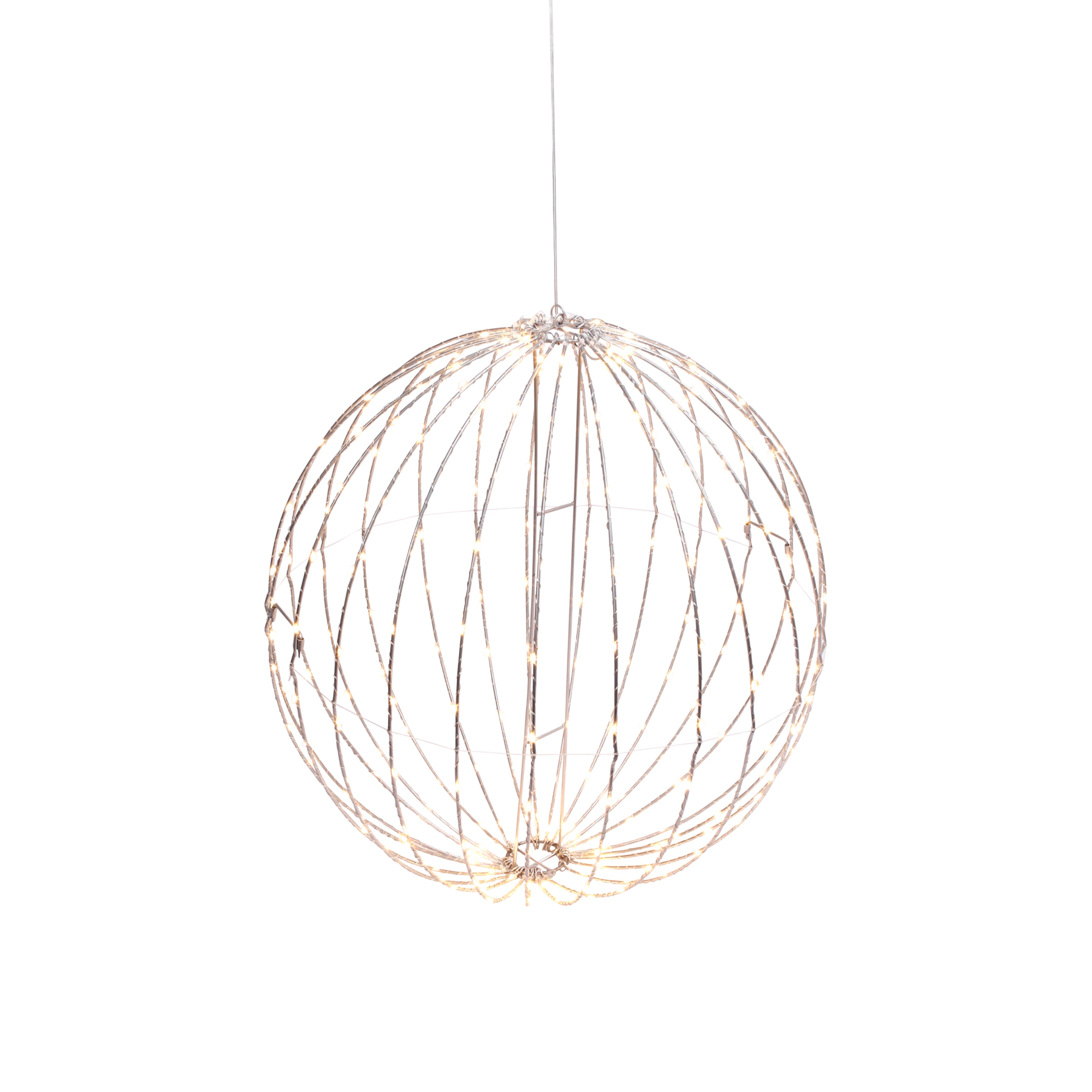 Hang this 15"Diameter open sphere to brighten your home, indoors or outdoors! w/150 micro led lights wrapped around the 16 wires that shape the circle it is eye-catching! Silver cord 118.1" (9.84-feet)silver cord. / This glowing sphere will light up your home any time of the year / w/150 micro LED lights it shines brightly / Folds up for easy storage / Silver cord length 300CM (118.1") w/UL approved adapter / Measures 15"L x 15" W x 17"H / For indoor/outdoor use