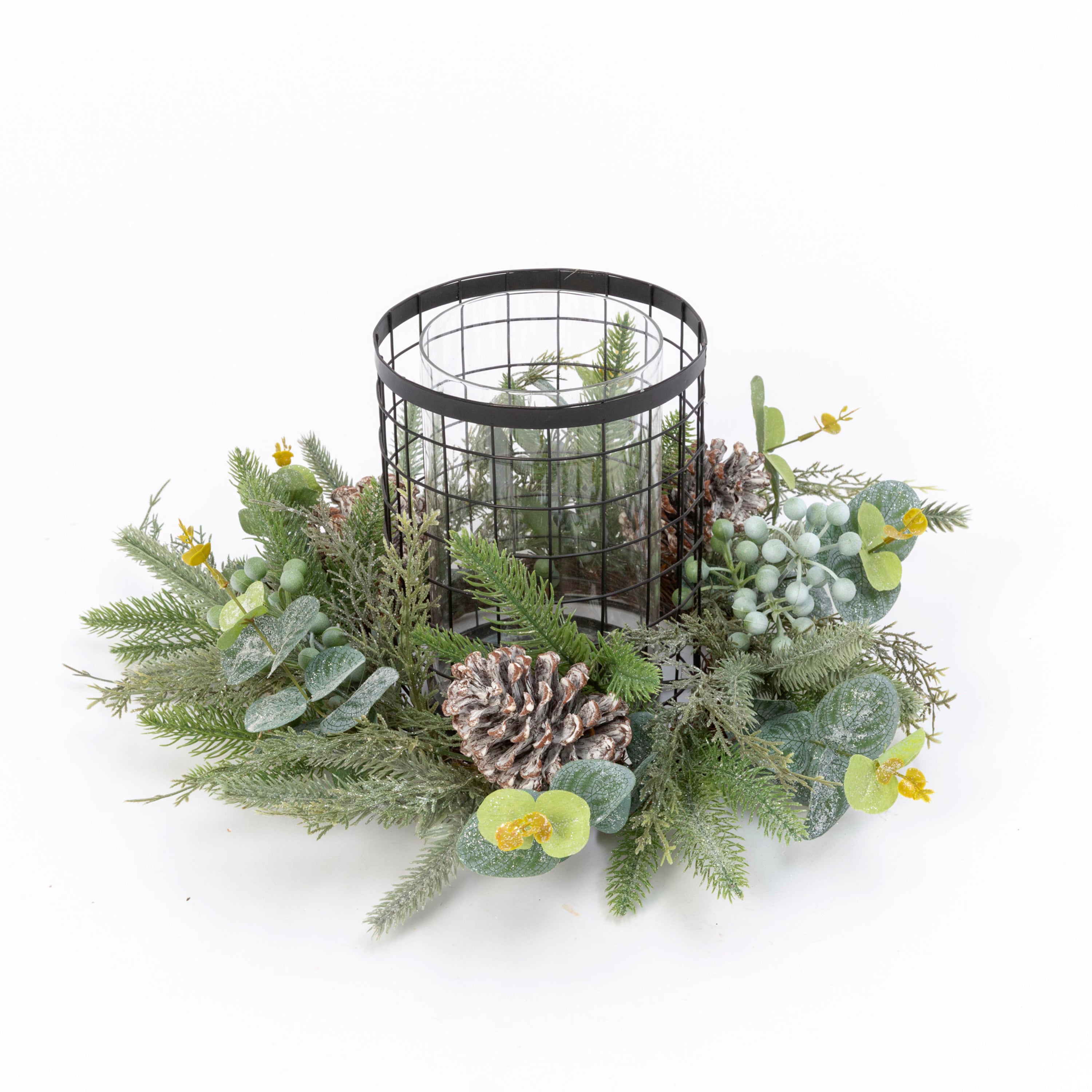 This 17"L holiday centerpiece is brimming w/mixed winter faux flora and fauna. At the center is a metal paned glass candle holder that is beautifully accented by the surrounding greenery. Candle not included / The center candle holder is black metal paned glass / Surrounded by a perfect combination of holiday greenery, pine cones and accents / Large enough to be a centerpiece, or place on a side table or mantle / Candle is not included / Measures 17"L x 17" W x 8.5"H / For indoor use only
