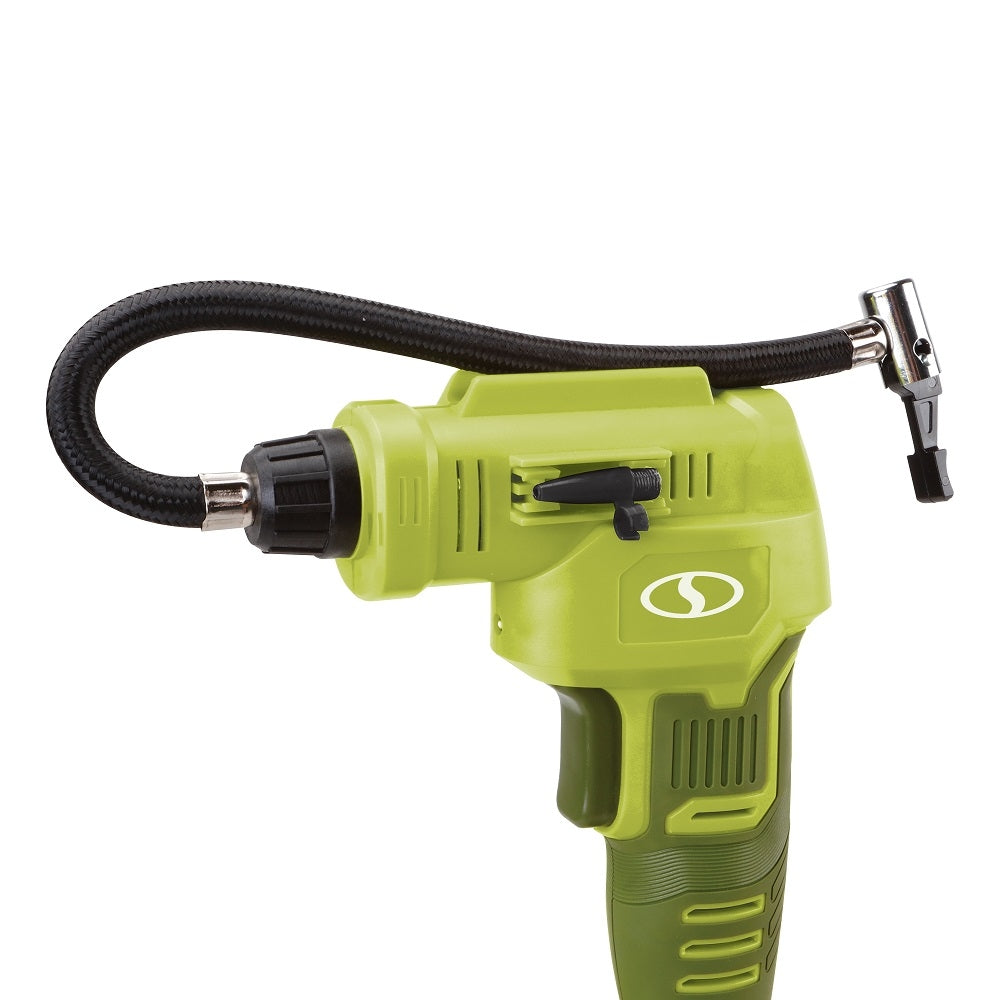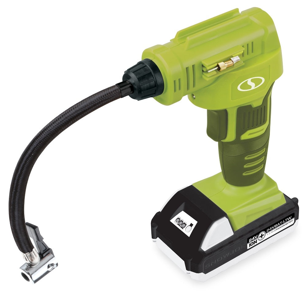 When the air is low -- pump it up -- and Go With Joe!Skip the trip to the gas station and reach for the powerful portable air compressor that fits in the palm of your hand with the 24V-AJC-LTW 24-Volt Cordless Air Compressor from SUN JOE.Compact and convenient for camping, or commuting - it's the power-packed rechargeable pump that's perfect anywhere power is at a premium -- like at the park, at the pool, or on the road. Keep tires at the perfect pressure, inflate a bike tire, pool float or sport ball in seconds. Simply set the PSI on the digital display and pull the trigger. The 24V-AJC-LTW automatically stops at your preset pressure.Unlike bulky gas-powered or electric tools, SUN JOE's 24-Volt cordless compressor employs the most advanced lithium-ion battery technology for no fade power, and peak performance under pressure! When the work is done, simply plug the battery in, power it up - and it's recharged and ready for your next inflation project!