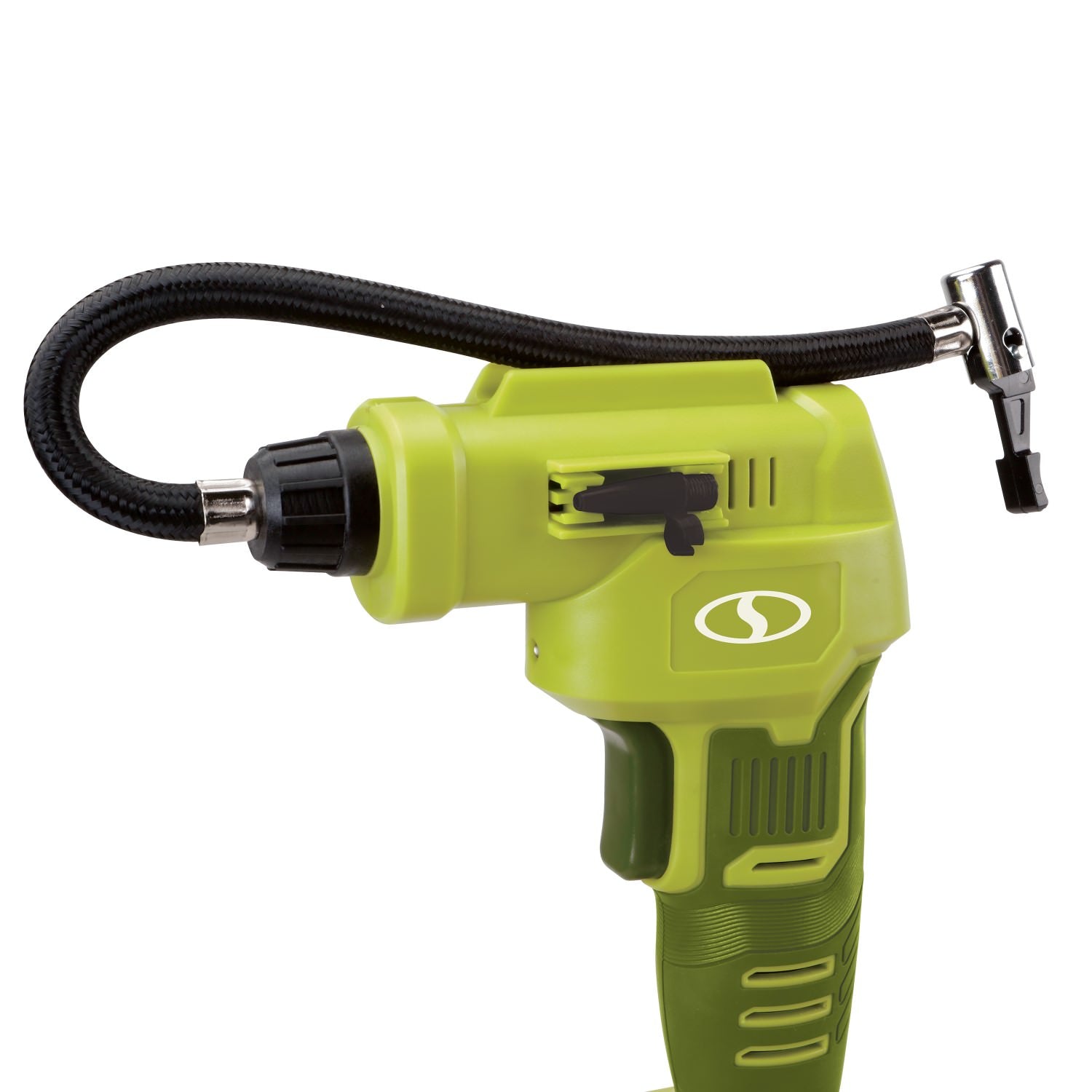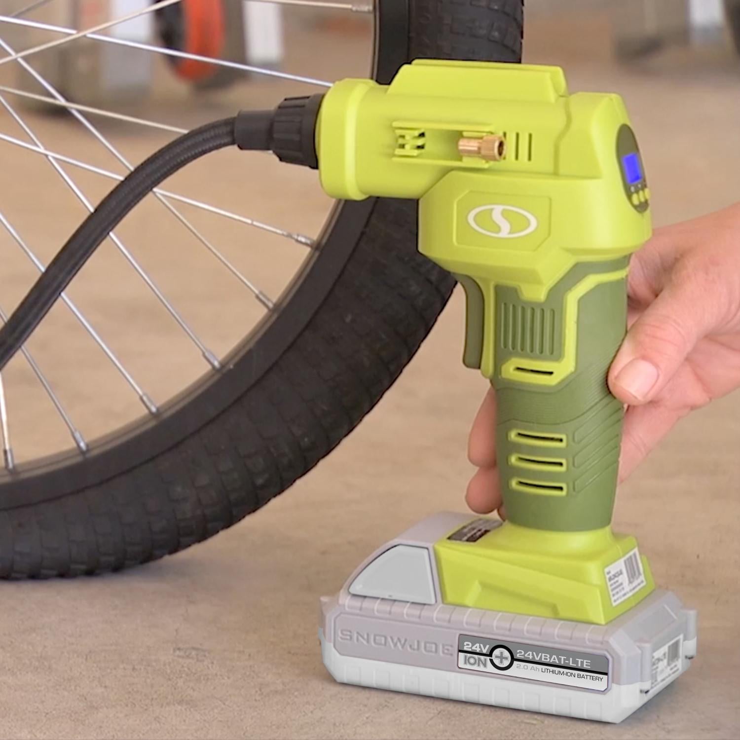 When the air is low -- pump it up -- and Go With Joe!Skip the trip to the gas station and reach for the powerful portable air compressor that fits in the palm of your hand with the 24V-AJC-LTE 24-Volt Cordless Air Compressor from SUN JOE.Compact and convenient for camping, or commuting - it's the power-packed rechargeable pump that's perfect anywhere power is at a premium -- like at the park, at the pool, or on the road. Keep tires at the perfect pressure, inflate a bike tire, pool float or sport ball in seconds. Simply set the PSI on the digital display and pull the trigger. The 24V-AJC-LTE automatically stops at your preset pressure.Unlike bulky gas-powered or electric tools, SUN JOE's 24-Volt cordless compressor employs the most advanced lithium-ion battery technology for no fade power, and peak performance under pressure! When the work is done, simply plug the battery in, power it up - and it's recharged and ready for your next inflation project!