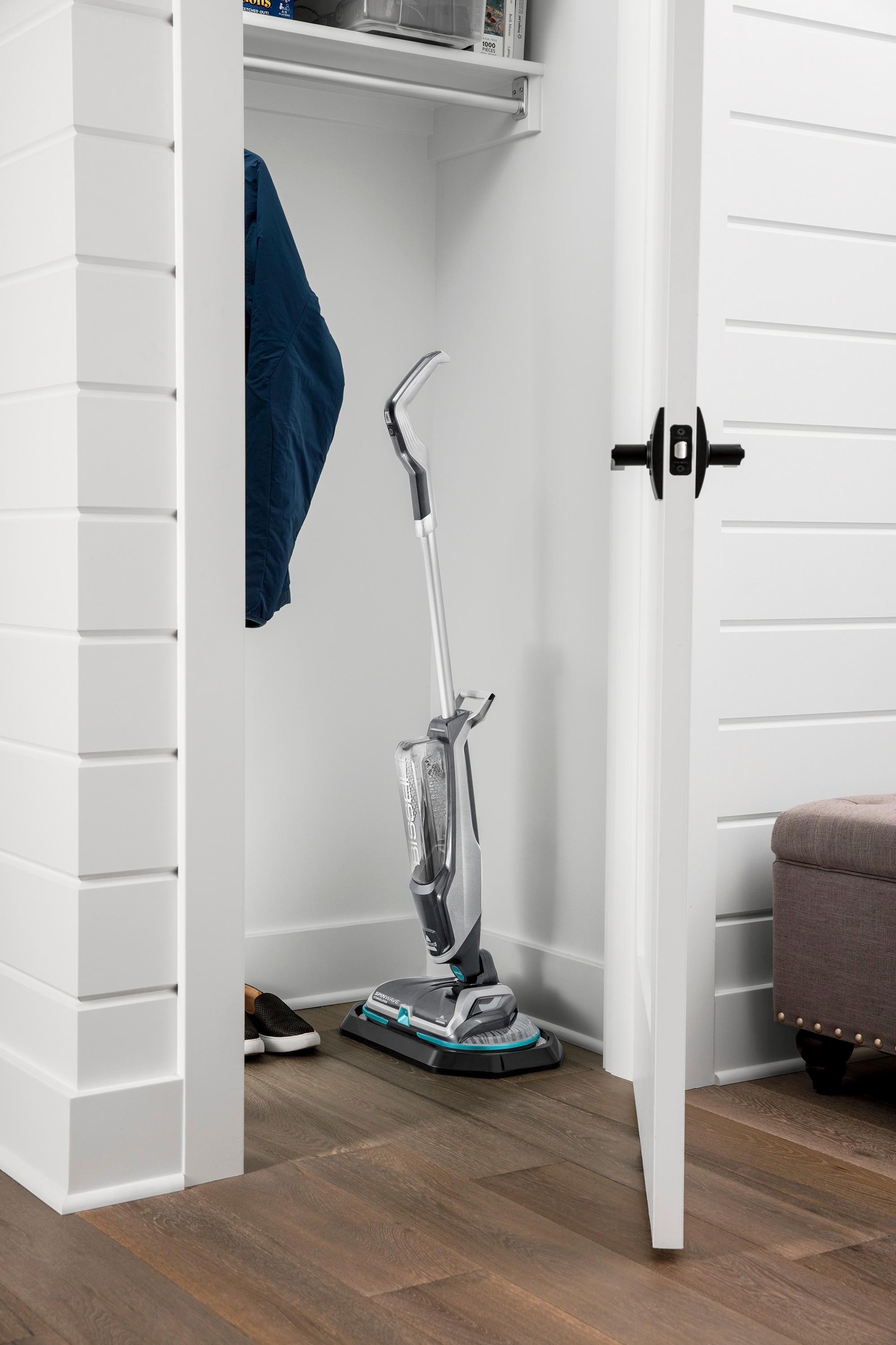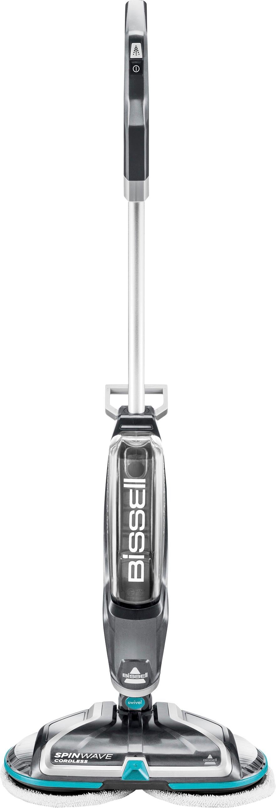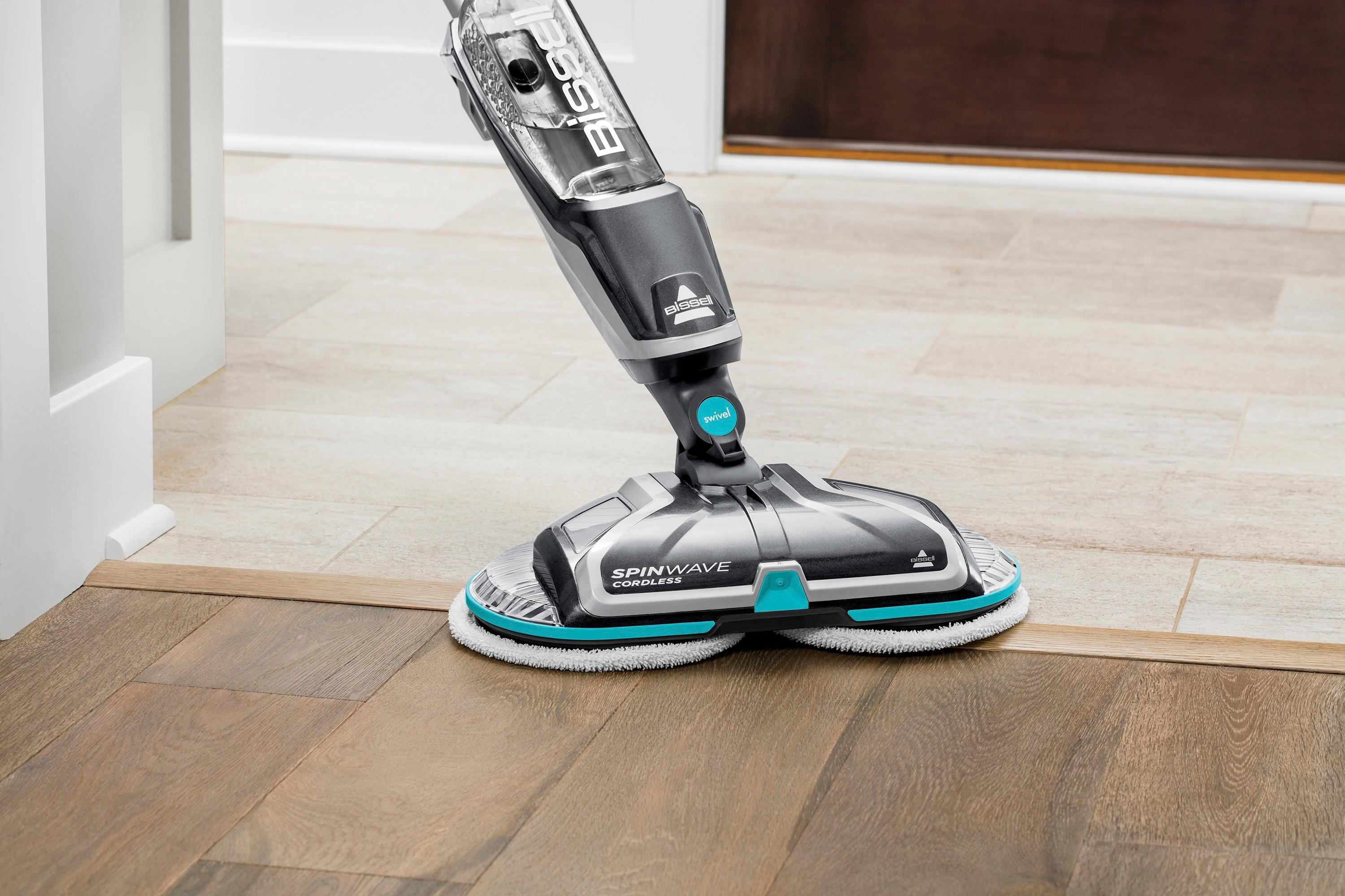 Clean sealed hard floors easily with this Bissell SpinWave cordless floor cleaner. It includes two types of pads that can clean a variety of surfaces, including tile and laminate, and restores the natural shine to wood floors. This Bissell SpinWave cordless floor cleaner has a 20-minute battery life, so you can clean a large area without recharging.