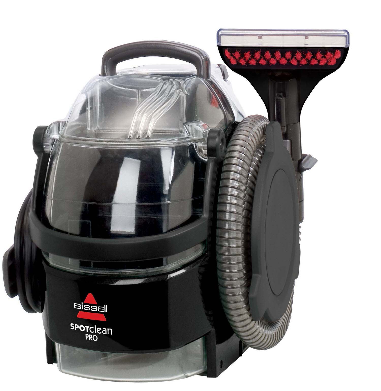 SpotClean Pro combines powerful suction scrubbing and cleaning for perfect results. Removes stubborn dirt and tough stains on carpet upholstery stairs rugs and more. Large capacity tank holds 3/4 gallon so you can clean more and refill less. 22ft Power cord cord allows you to clean hard-to-reach areas. 4ft Hose length. Convenient carry handle. Includes: 3" Tough Stain tool. 6" Stair tool. Trial size Bissell Professional Deep Cleaning formula.