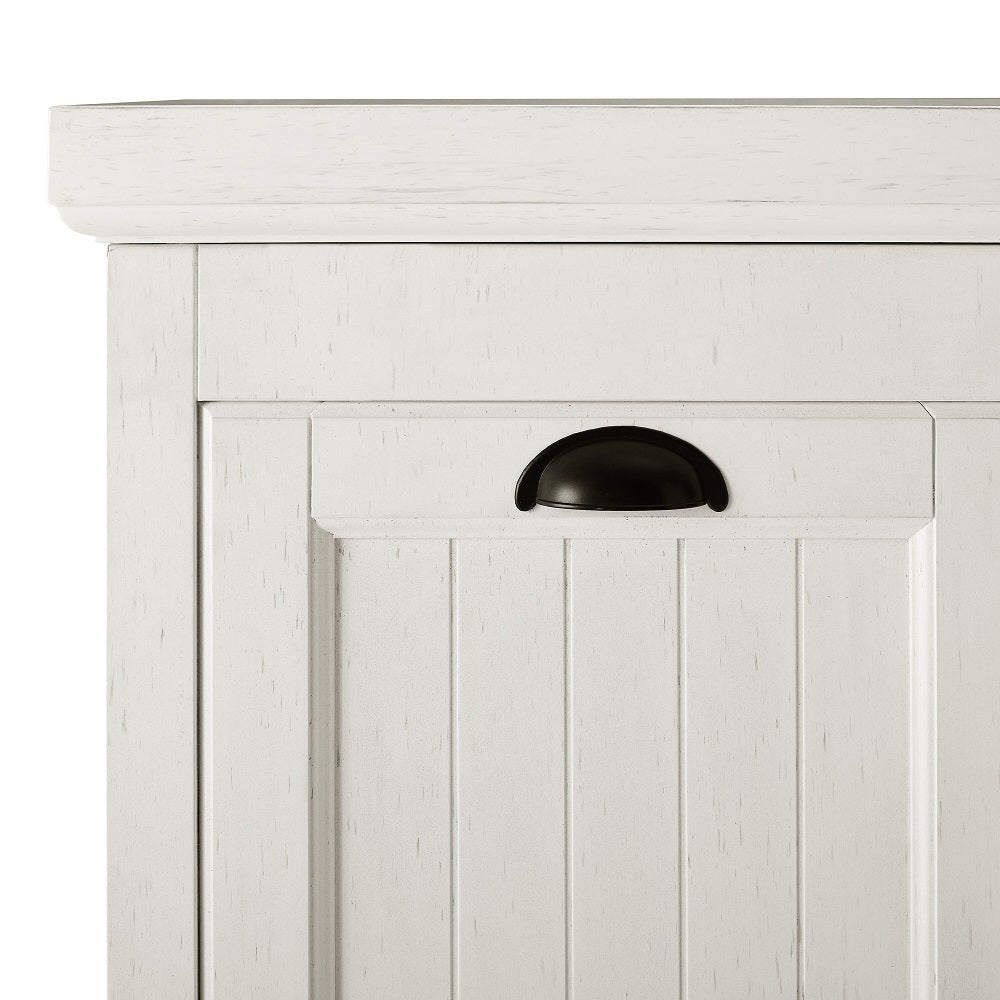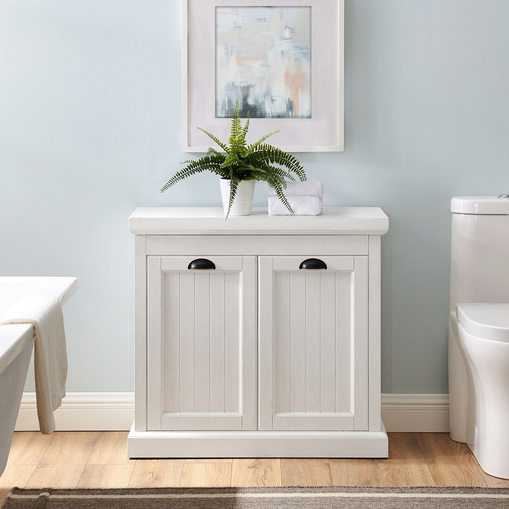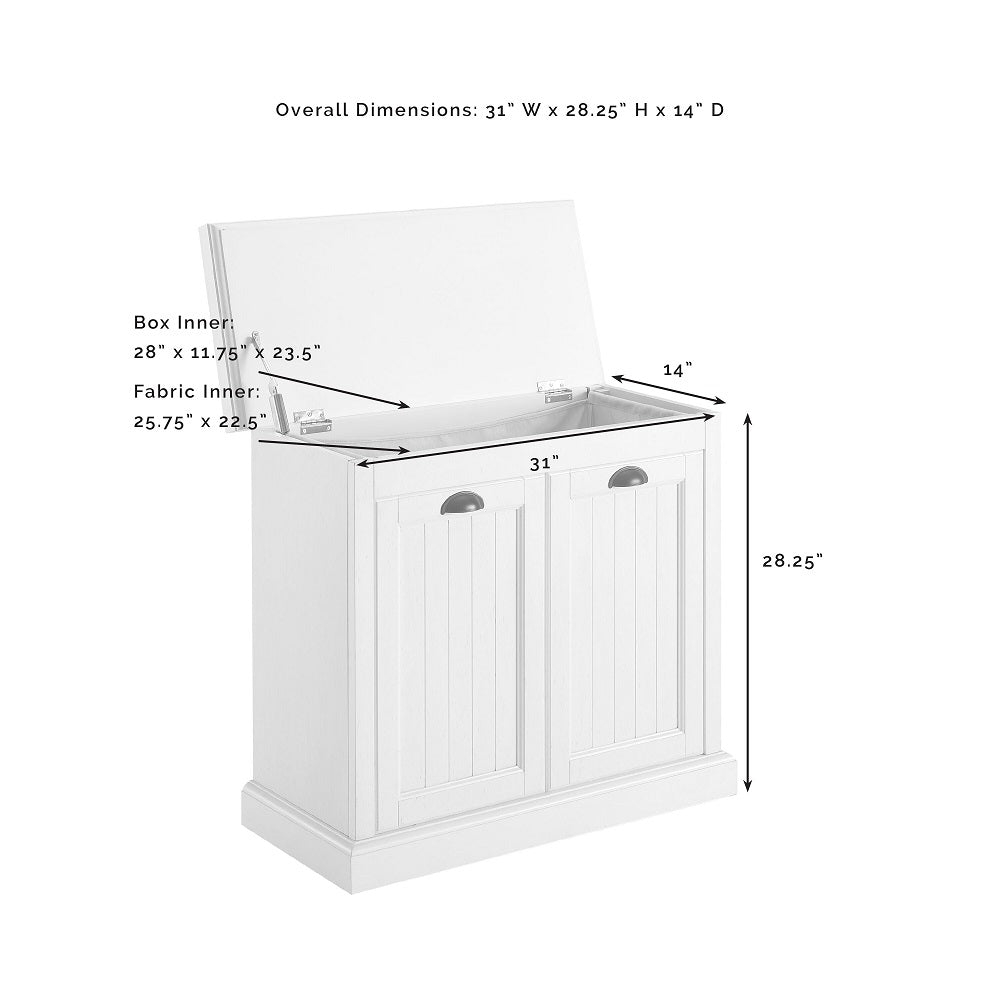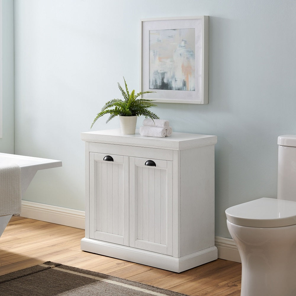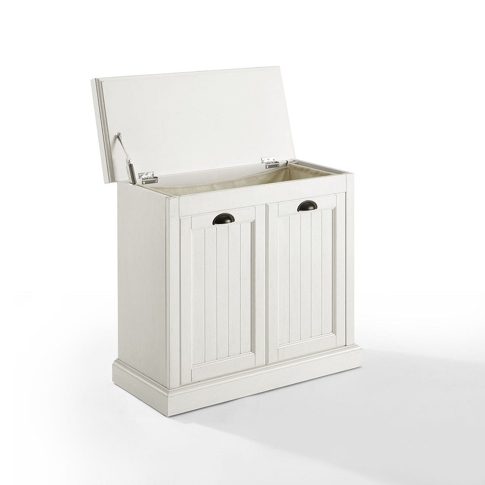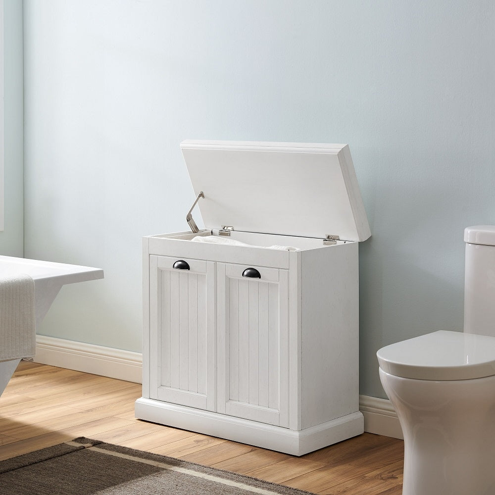 Sure to be a laundry room essential, the Seaside Lift-Top Linen Hamper brings coastal cottage style to your daily routine. Featuring a lift-top design, the hinged door opens to a large, removable cloth bag that makes transporting your laundry a breeze. Decorative metal hardware and classic beadboard paneling make the Seaside Lift-Top Linen Hamper a lovely addition to any bathroom, bedroom, or laundry area.