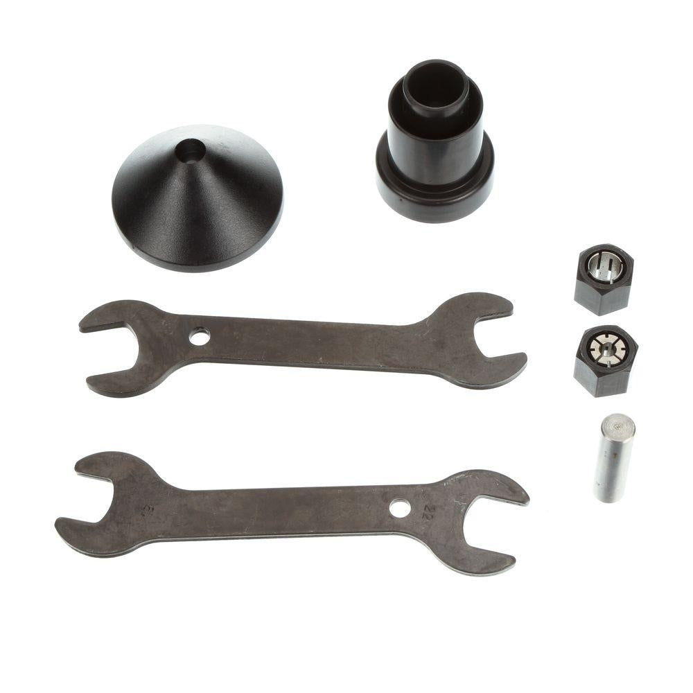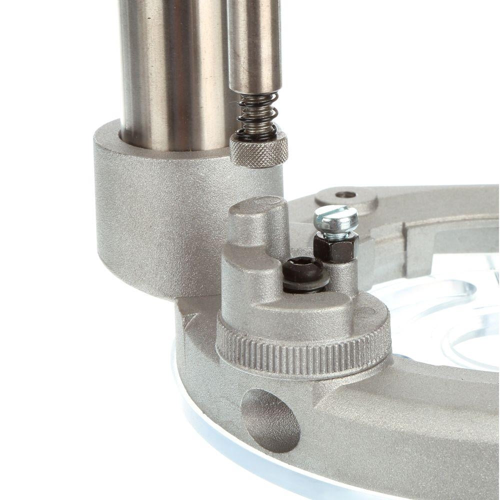 1-3/4 HP (maximum motor HP) 11.0 Amp motor. Micro-fine depth adjustment ring. Adjustable tool-free steel motor cam lock. Quick release motor latches. Detachable cordset. Sub-base concentricity gauge included. Precision machined brass bushings. Case-hardened steel guide rods. Clear sub-base. Die-cast aluminum base and motor housing