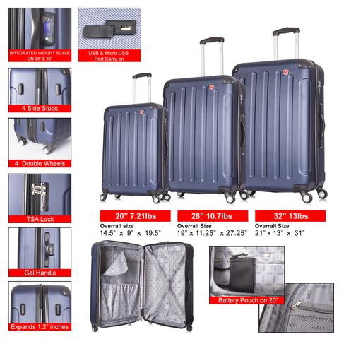 The DUKAP Intely Smart collection is made of lightweight PC/ABS engineered material with micro diamond finish. The hard-flex construction offers maximum strength, durability and a water/scratch resistant finish. Offering a contemporary modern style with 4 dual spinner 360° wheels for effortless mobility, built in TSA Approved combination lock, 1.2" expandable for additional space, front protective corner bumpers to withstand higher impacts, full interior fabric lining with zippered compartment on one side and snap-on straps on the opposite side for easy packing plus one inside mesh zippered pocket and 2 slip pockets for shoes, push button locking internal retractable trolley system, top and side ergonomic GEL handles for comfortable and easy lifting, 4 side studs that allows the luggage to stand upright on its side and smooth gliding oversized zippers. Also featured is an integrated USB and Micro USB port providing access to power on the go (Portable power bank not included)
