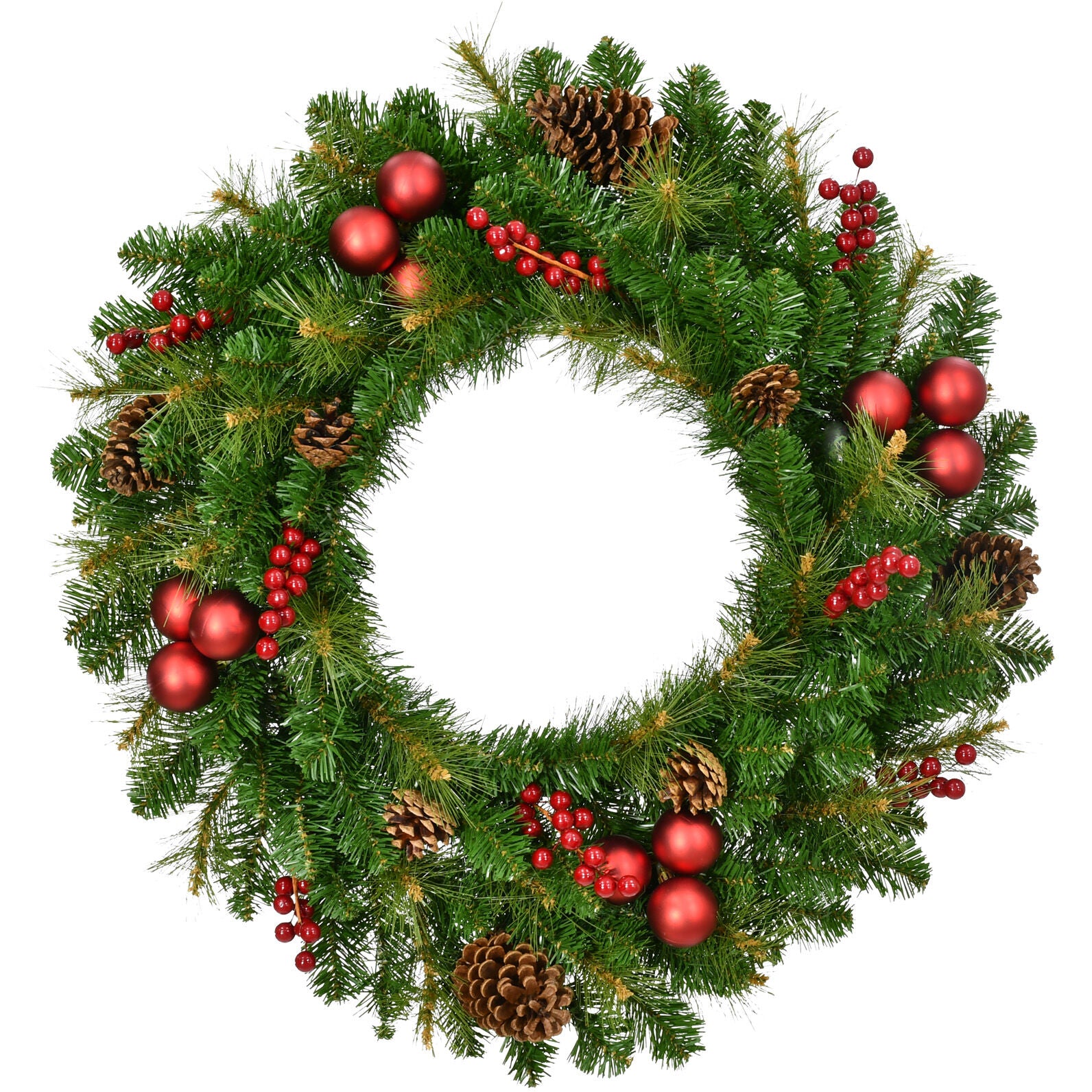 Spruce up your holiday decor with a 30-inch round Joyful wreath from Fraser Hill Farm. This lovely wreath brings all the realistic detail of a live wreath with timeless elegance that lasts year after year. Made with flame-retardant and non-allergenic materials, this Christmas classic is the perfect alternative to the real thing. Lifelike are accented with natural pinecones, artificial red berries, and shiny baubles. This beautiful wreath radiates a festive spirit, whether you're decking the halls indoors or out. Hang your new wreath on the door, on the wall, or above the fireplace mantle, and welcome each guest with holiday cheer that will last from one season to the next.