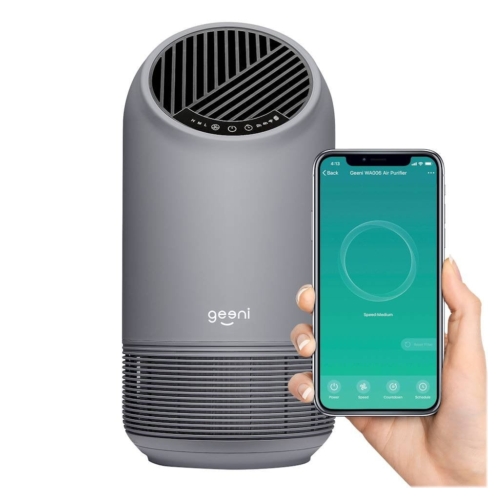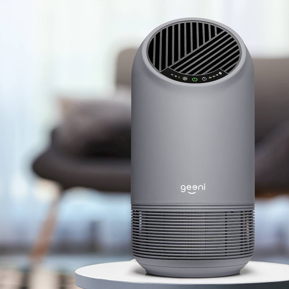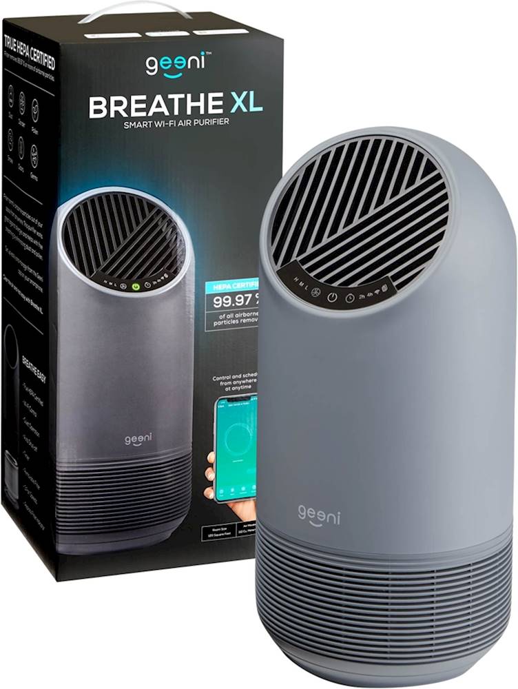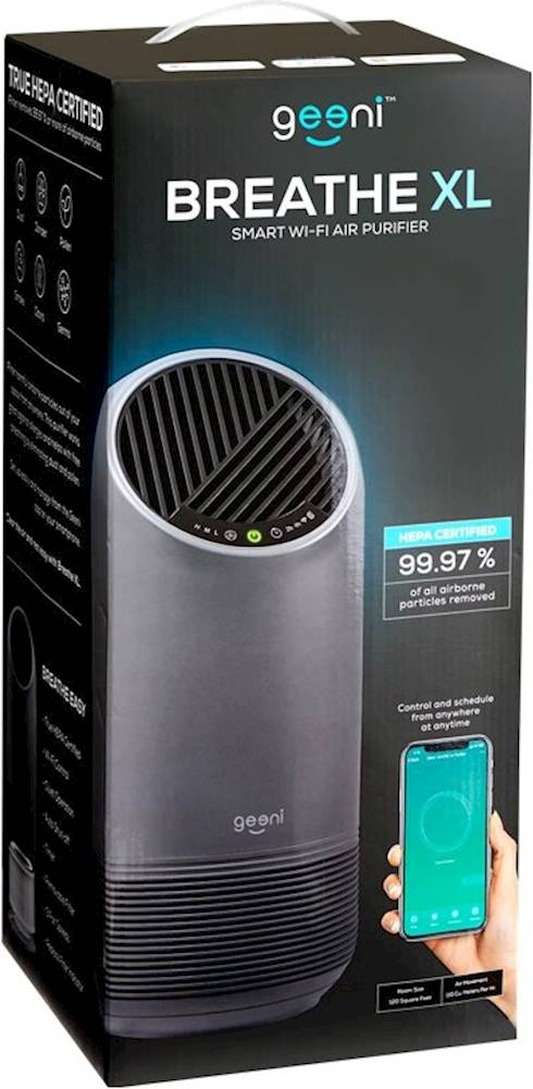 Breathe easier with this Geeni Breathe XL smart air purifier. The HEPA-certified filter removes up to 99.97 percent of airborne particles, and the integrated fan circulates the air at a rate of up to 110 cubic meters per hour. This Geeni Breathe XL smart air purifier has integrated Wi-Fi connectivity that offers convenient remote operation.