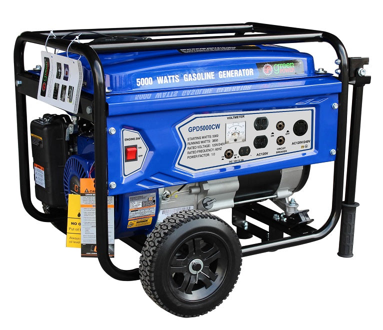 Gas Generator, 5000watts Starting/ 3850watts Running,Consumer Select Poratble Design with 8" Never-Flat Wheels Help Consumer to Get Enough Power with Low Cost, Easy to Move, Suitable for Campaign, Recreation, Enmergency Purpose.120V and 240V Outletst all with Overload Protector. Big and Bright Voltage Meter Easy to read.
