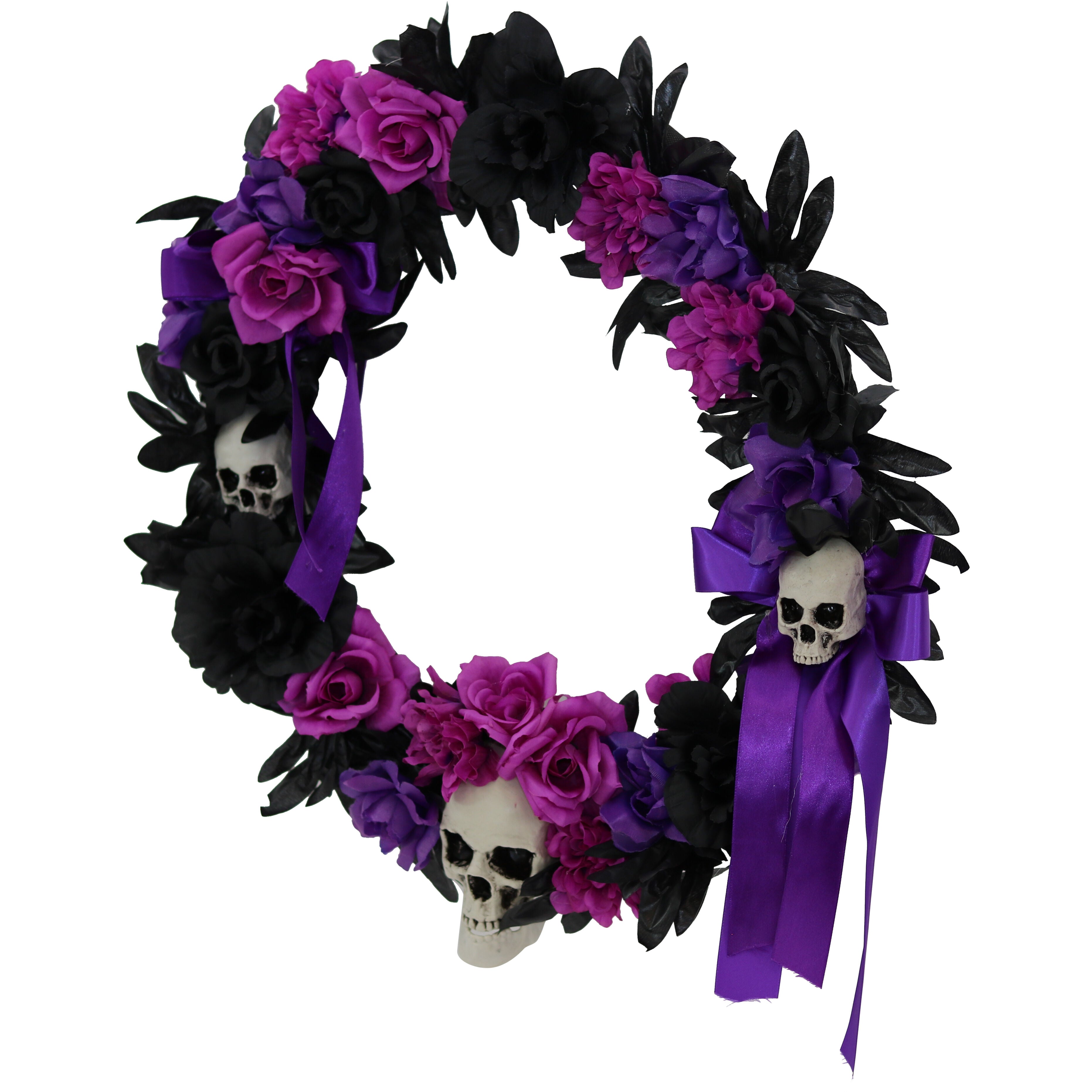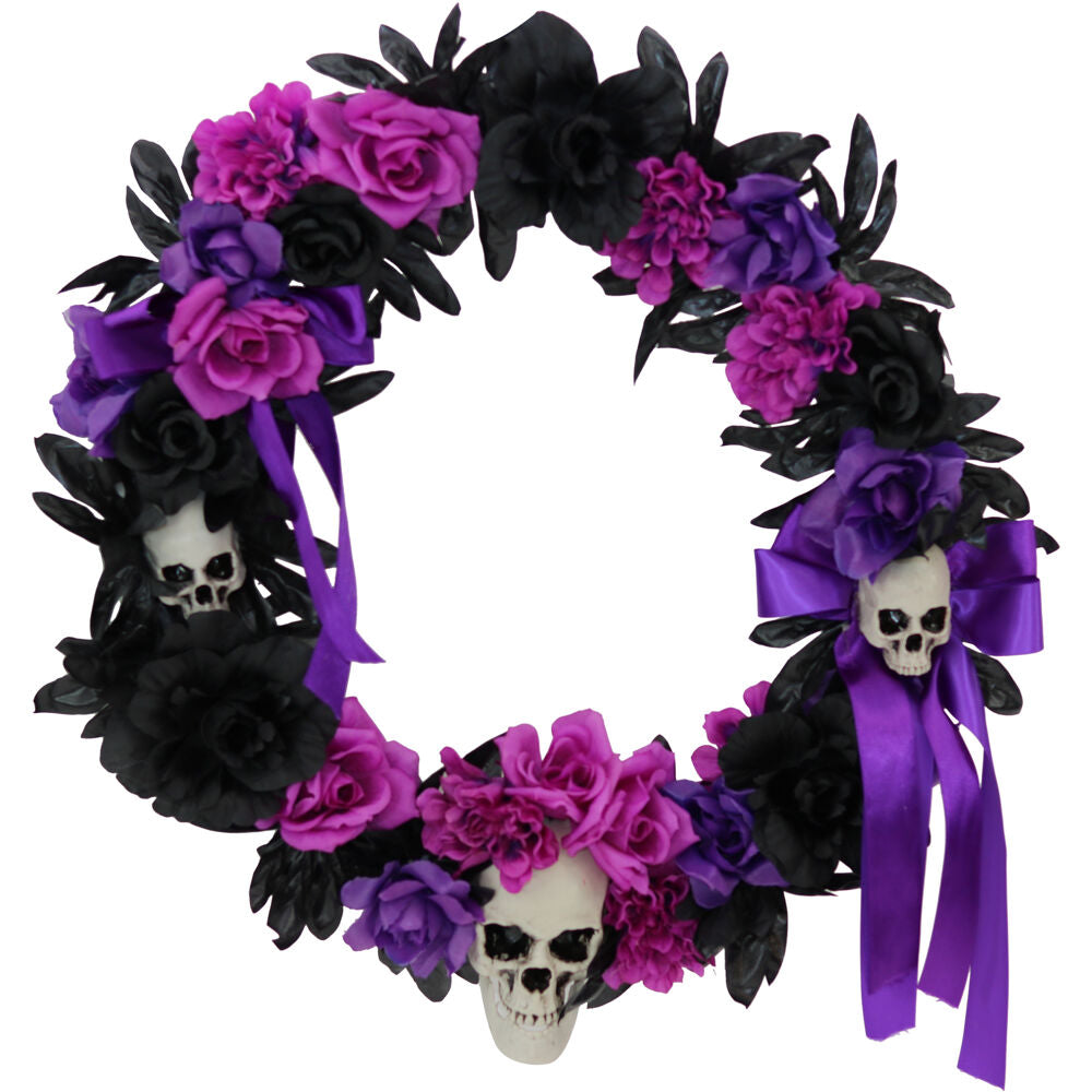 Be afraid. Be very afraid of Haunted Hill Farm’s Decoration Collection. These blood curdling decorations are sure to terrify any trick-or-treaters, co-workers, or customers. This Halloween wreath will add the perfect creepy touch to your holiday decorations. Accented with purple, black, and pink ribbons and flowers, it will curse your door with an ominous, sinister air. Three skulls on the wreath give it an extra chilling essence—they will stare out at your visitors with deathly smiles and hollow eyes. Accent your home with festive, fearsome decorations with this dark holiday wreath from Haunted Hill Farm.