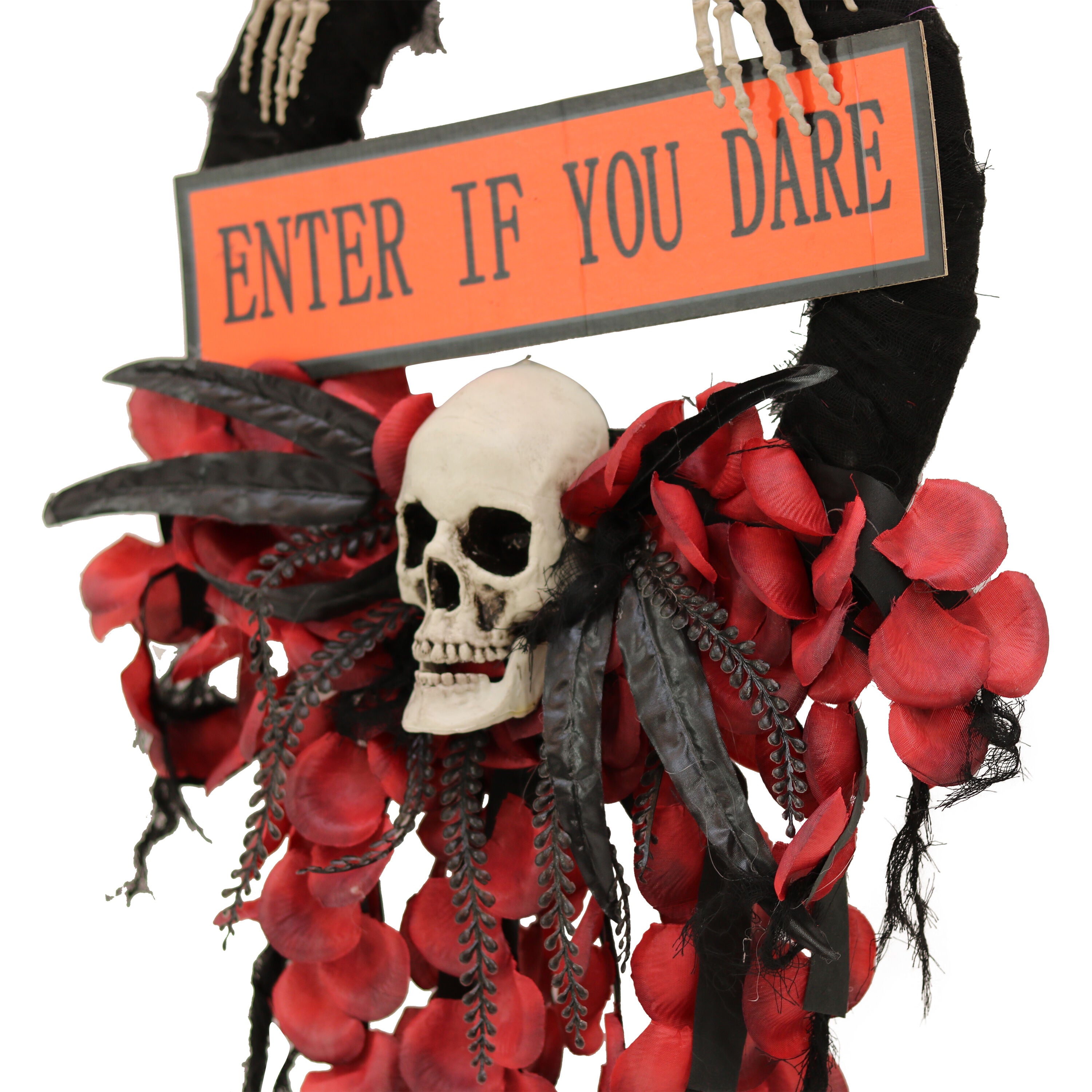 Be afraid. Be very afraid of Haunted Hill Farm’s Decoration Collection. These blood curdling decorations are sure to terrify any trick-or-treaters, co-workers, or customers. Hang this wreath from your porch, at your doorway, or outside of your haunted house for an extra scary flair. The piercing white lights shining from the skulls eyes add to the spooky aura that this wreath gives. The orange of the sign contrasts perfectly with the red and black embellishments of the wreath and haunts all who cross its path. Enter if you dare the sign warns, because with Haunted Hill Farm this Halloween will be the scariest yet.