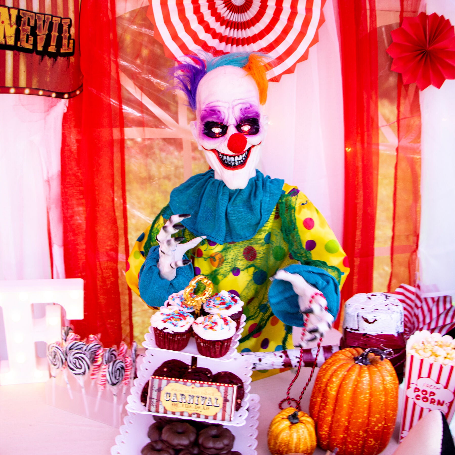 Be afraid. Be very afraid of Haunted Hill Farm's Clown Collection. These blood curdling creatures are sure to terrify any trick-or-treaters, co-workers, or customers. They don’t call him Blade for no reason. This evil clown’s insults cut deeper than a knife. Invite Blade to your home this season and trick-or-treaters will stop in their tracks. As Blade greets guests with wicked taunts and cruel cackles, his eyes glow eerily and entire body moves. The unsettling carnival music that plays around Blade’s colorful body is a perfect backtrack to his one-man show. Hang him from your doorway, porch, or in any room and Blade will conduct a sinister circus all of his own. Like he says, here comes trouble…