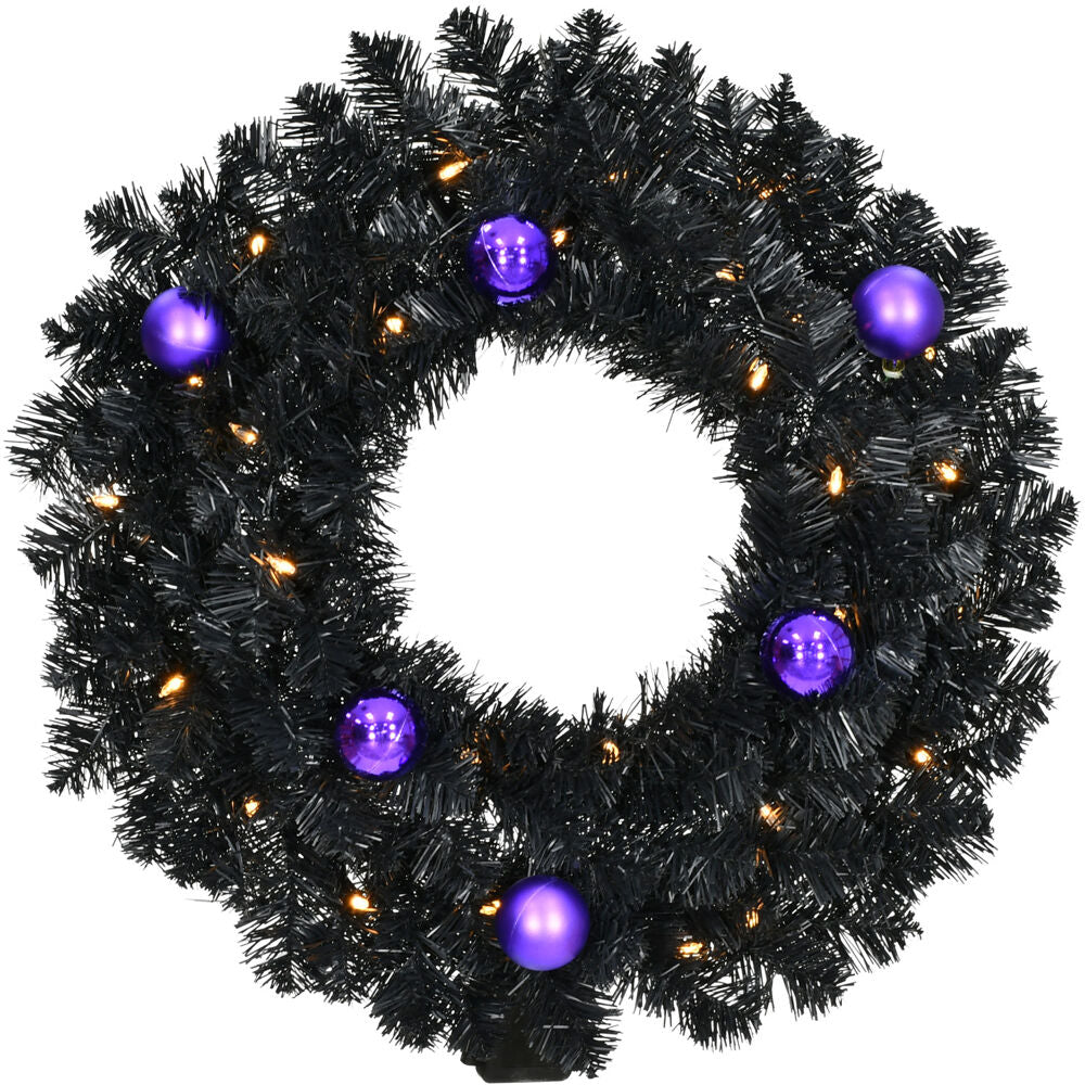 Haunted Hill Farm 24-In. Spooky Black Tinsel Wreath with Warm White LED Lights and Purple Ornaments