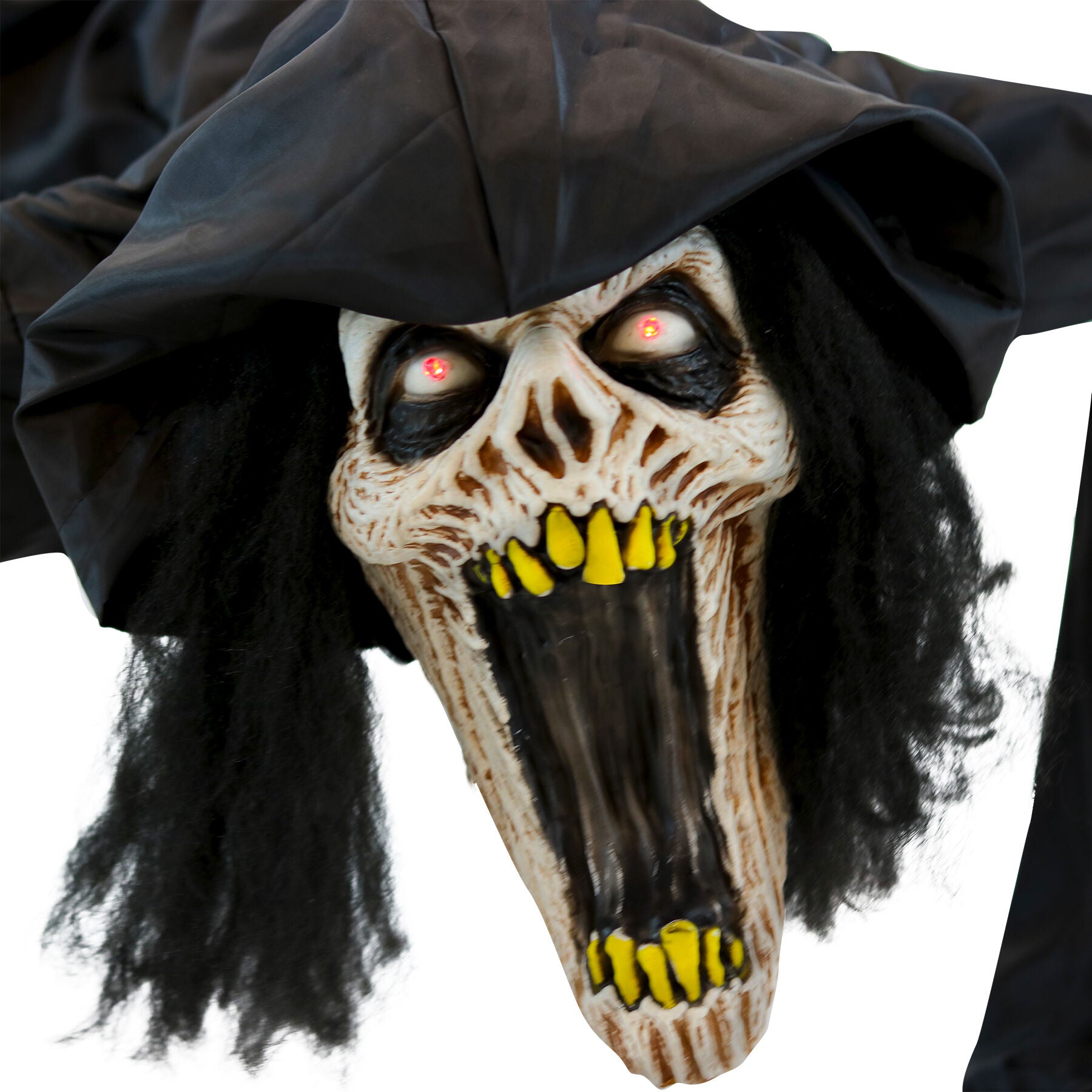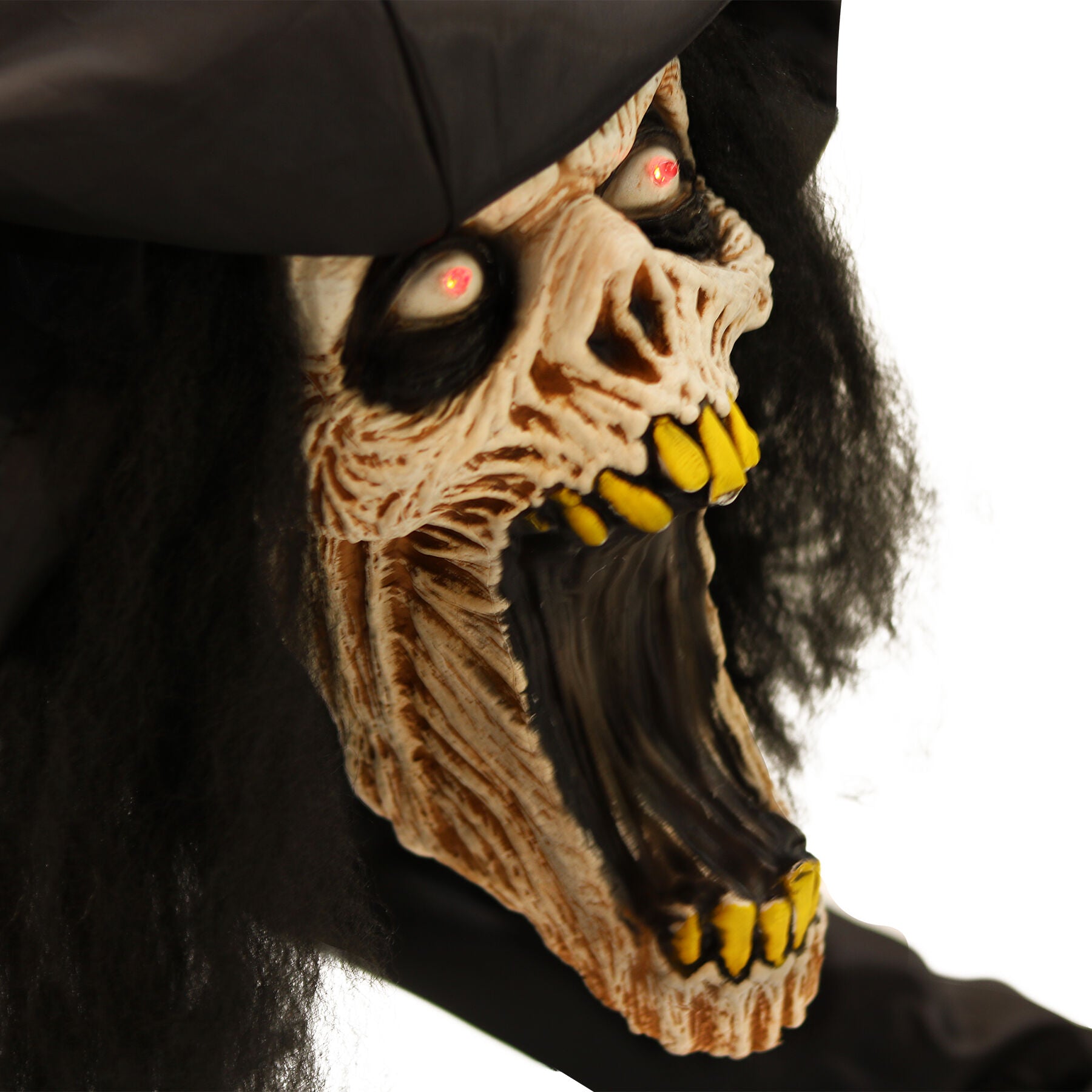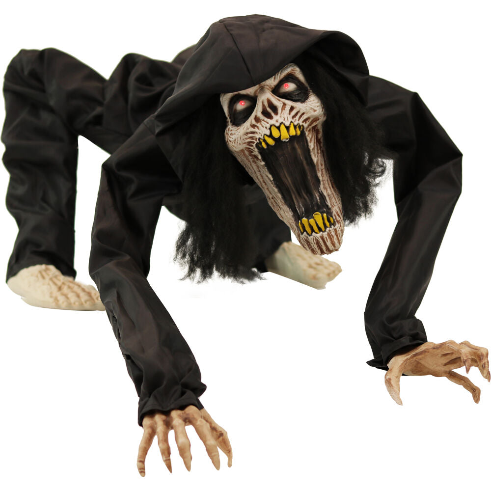 Be afraid. Be very afraid of Haunted Hill Farm's Lawn of the Dead Series. These blood curdling creatures are sure to terrify any trick-or-treaters, co-workers, or customers. Banshee is a spirit like no other. On Halloween, his tormented soul awakens. Draped beneath a black cloak and hood, he sways his head and shoulders side to side as he seeks prey. Visitors will hear his guttural groans before they even meet the terrifying creature. When they do, Banshee’s hunched body will terrify even the bravest, but not more than his wide-open mouth lined with jagged yellow teeth. His flashing red eyes will illuminate any who dare get too near. Although the hands that emerge from Banshee’s cloak my look human, the creature is anything but. And running is futile… the sound of Banshee’s roars will follow guests into the night.