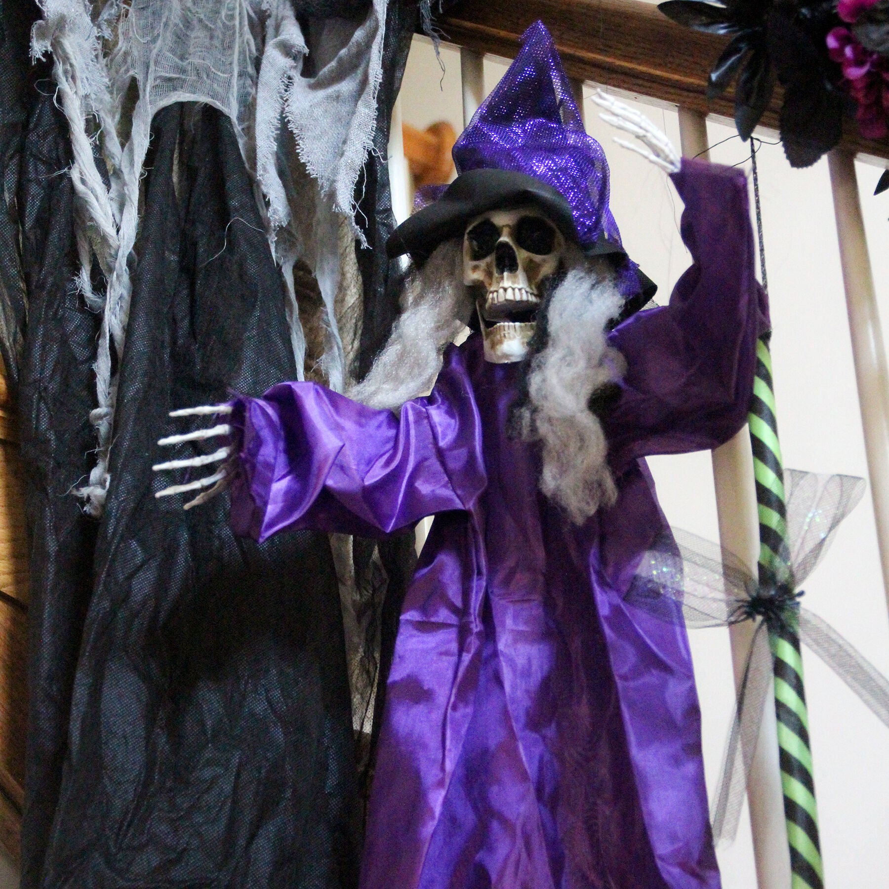 Be afraid. Be very afraid of Haunted Hill Farm’s curses and cauldrons collection. These blood curdling creatures are sure to terrify any trick-or-treaters, co-workers, or customers. This hanging witch will scare children and adults alike with her skeleton face and bony fingers. Her long gray hair and purple robe will evoke that familiar creepy feeling of witches so that when gazing upon her skull face you will have the horrifying experience of running into a dead witch hanging from the ceiling. Expect lots of screams and scares when your guests come across this spooky witch unexpectedly.