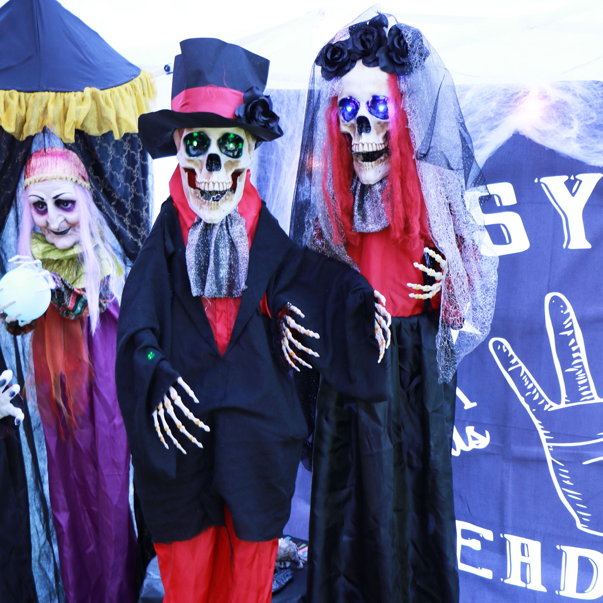 Be afraid! Be very afraid of Haunted Hill Farm’s Voodoo collection. These blood-curdling creatures are sure to terrify any trick-or-treaters, co-workers, or customers. Jacqueline, the Voodoo Bride, is not afraid of her magic… but you should be. Her glowing blue eyes are sure to scare the bravest of brave and will leave you feeling her presence on with long after you're gone. If that wasn't scary enough, her touch-activated voice comes alive with striking mystical sounds of lightning layered over the chilling cackles along with her horrifying laugh. Jacqueline's penetrating gaze will ensure that no matter where you run or try to hide, she still sees you.
