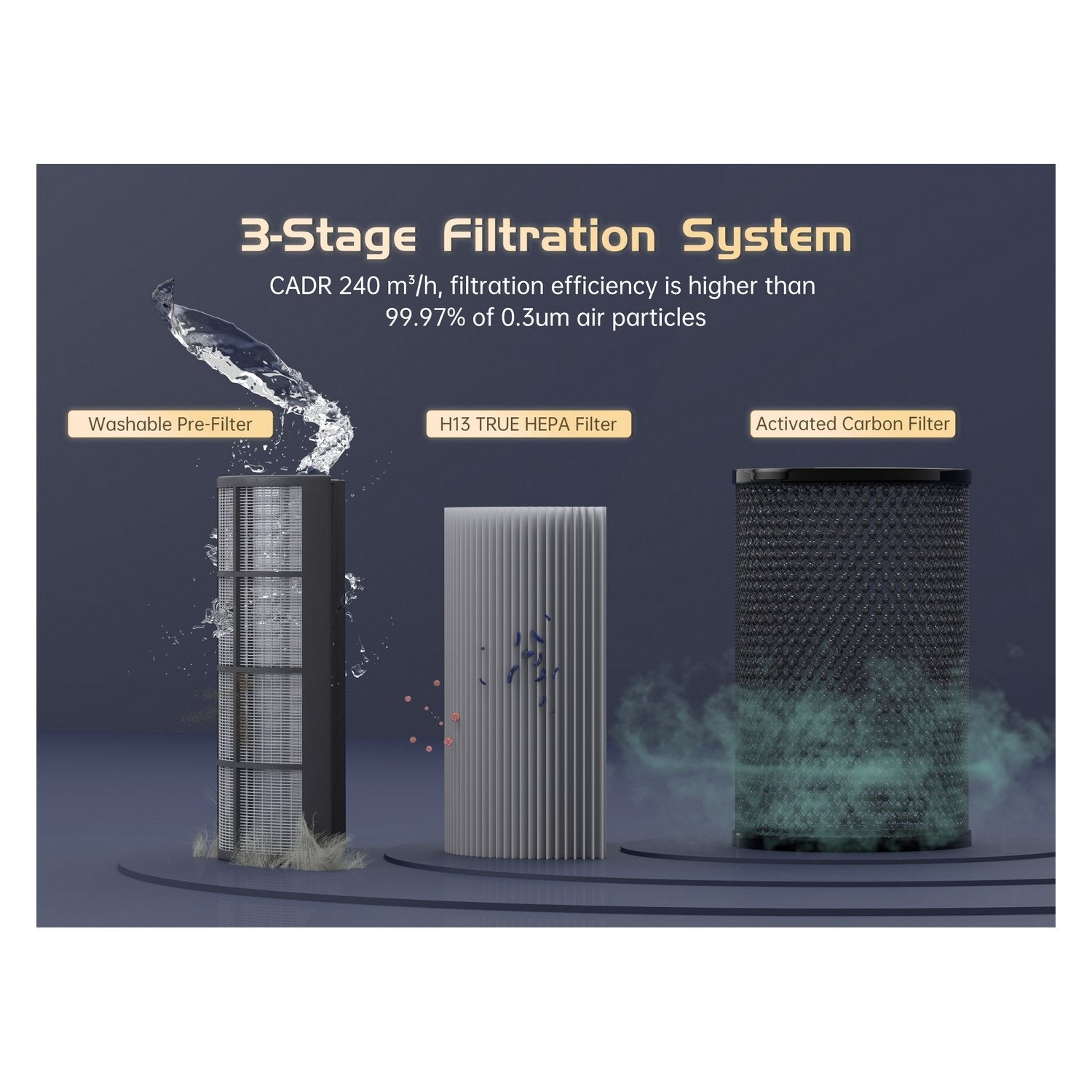 Efficient filtration System coupled with the pre-Filter, H13 true HEPA filter, and carbon filter quickly eliminate a variety of allergens, including mold, smoke, pollen, dust and pet dander. This Vigoair P5 air purifier has a topside HD LED smart control panel,LED Night Light and filter replacement reminder feature.