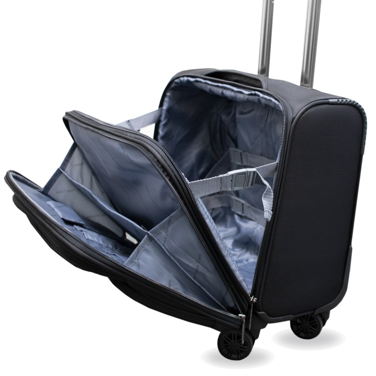 Stow your items worry-free with the Madison spinner briefcase. A great solution for business trips, this 17-inch rolling briefcase features three layer compartments and front zipper pockets to store and protect your laptop, documents, and even a change of clothes. The compact design is perfect for business trips, weekenders, and daily commutes.
