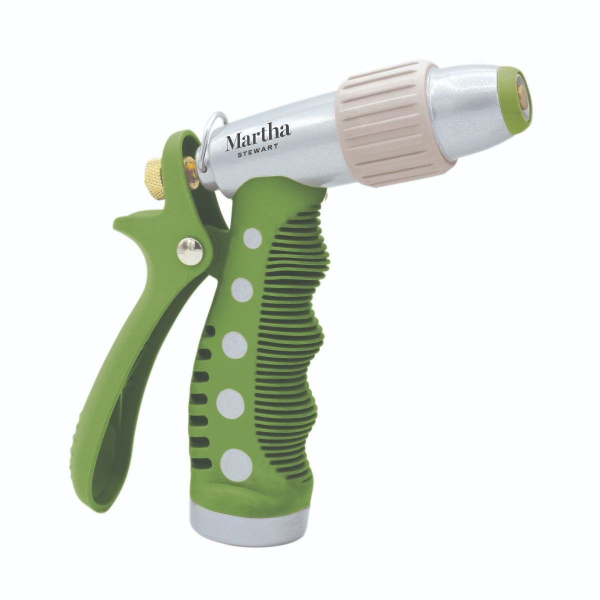 Adjust water flow on both nozzles with the flow control knob and set your perfect pressure to suit your lawn and garden. Then, lock-in your spray adjustment settings with the trigger lock feature — no more constant squeezing; just continuous, even water flow. Plus, the heavy-duty metal construction and comfortable, ergonomic grip is built for reliable, continuous use — season after season. Make your garden the envy of the neighborhood with Martha Stewart’s exclusive watering collection.