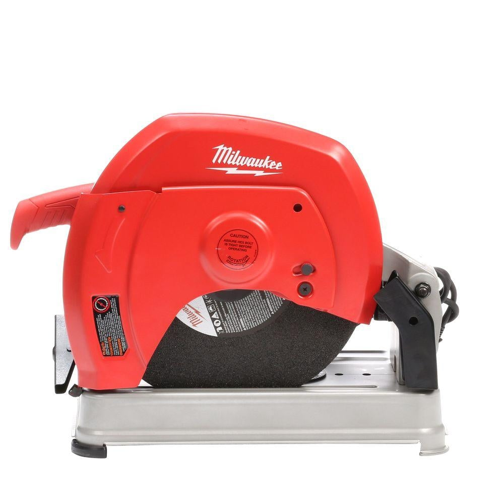 Durable and powerful with a 15 Amp, 4 MAX HP motor, the Milwaukee 14 in. Abrasive Cutoff Machine delivers exceptional and long-lasting performance. With speeds up to 3900 RPM, you can cut drywall track in bundles, angle iron, conduit, pipe, channels, tubing and rebar up to a 5 in. capacity quickly and with accuracy. The lightweight design allows easy portability without sacrificing durability, while the oversize wheel guards provide added protection from debris. Featuring a 45 miter capacity with an adjustable fence for quick and accurate miter cuts without flipping heavy material, the large spindle lock button provides quick and easy blade changes for less downtime and the quick adjust vise clamp allows quick clamp adjustment when cutting different material sizes.