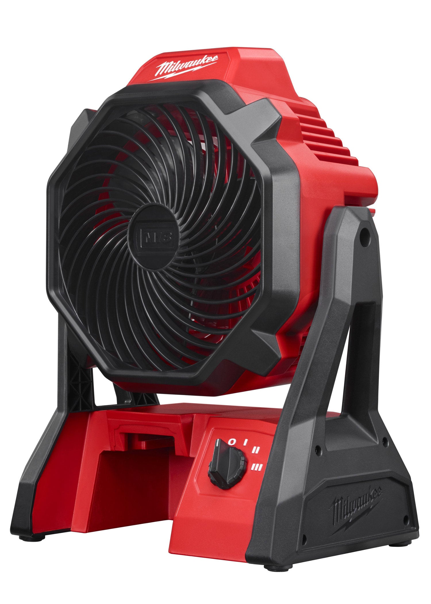 Circulates air over 40ft. Adjustable head pivots 120 degrees. 9 Stopping positions. 4 Keyhole hangers. 2 Hanging holes. Speed on high: 2350 RPMs. Speed on low: 1370 RPMs. Max air flow: 18 MPH/284 CFM. Includes AC Adaptor. M18 Battery and charger NOT included.