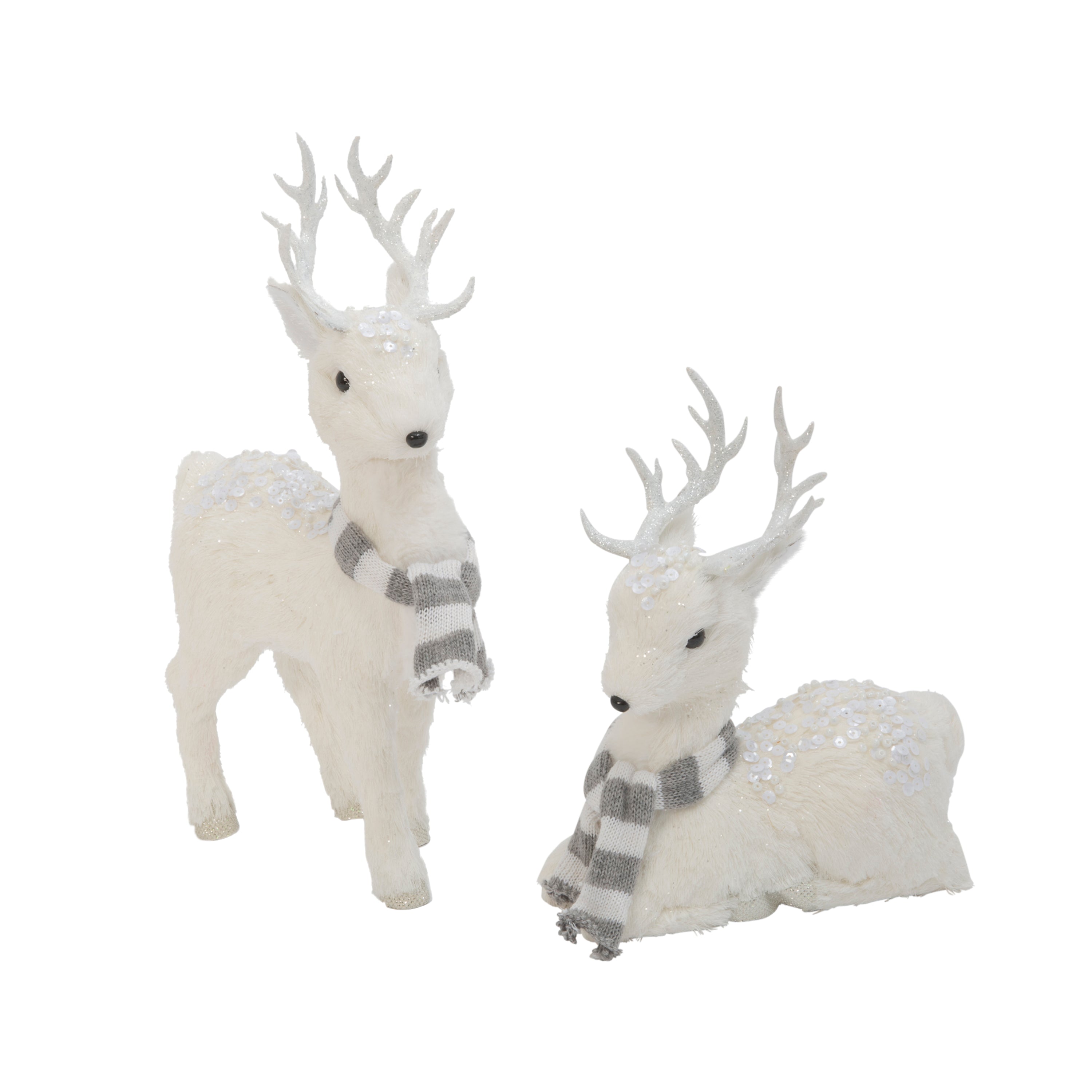 This Set of 2, marvelously crafted winter white deer, w/warm Gray and white striped sweaters around their necks, will be a welcome addition to your holiday décor. Their faux fur is adorned w/glittery white sequins and beads. White glittery antlers and textured silver glitter hooves complete the set. / Stunningly beautiful, this pair of deer will make everyone smile / Majestic yet peaceful holiday accents / White faux fur w/white glittery accents / Gray and white striped sweaters wrapped around their necks keeping them warm / Measures 9"L x 4" W x 13.75"H / For indoor use only