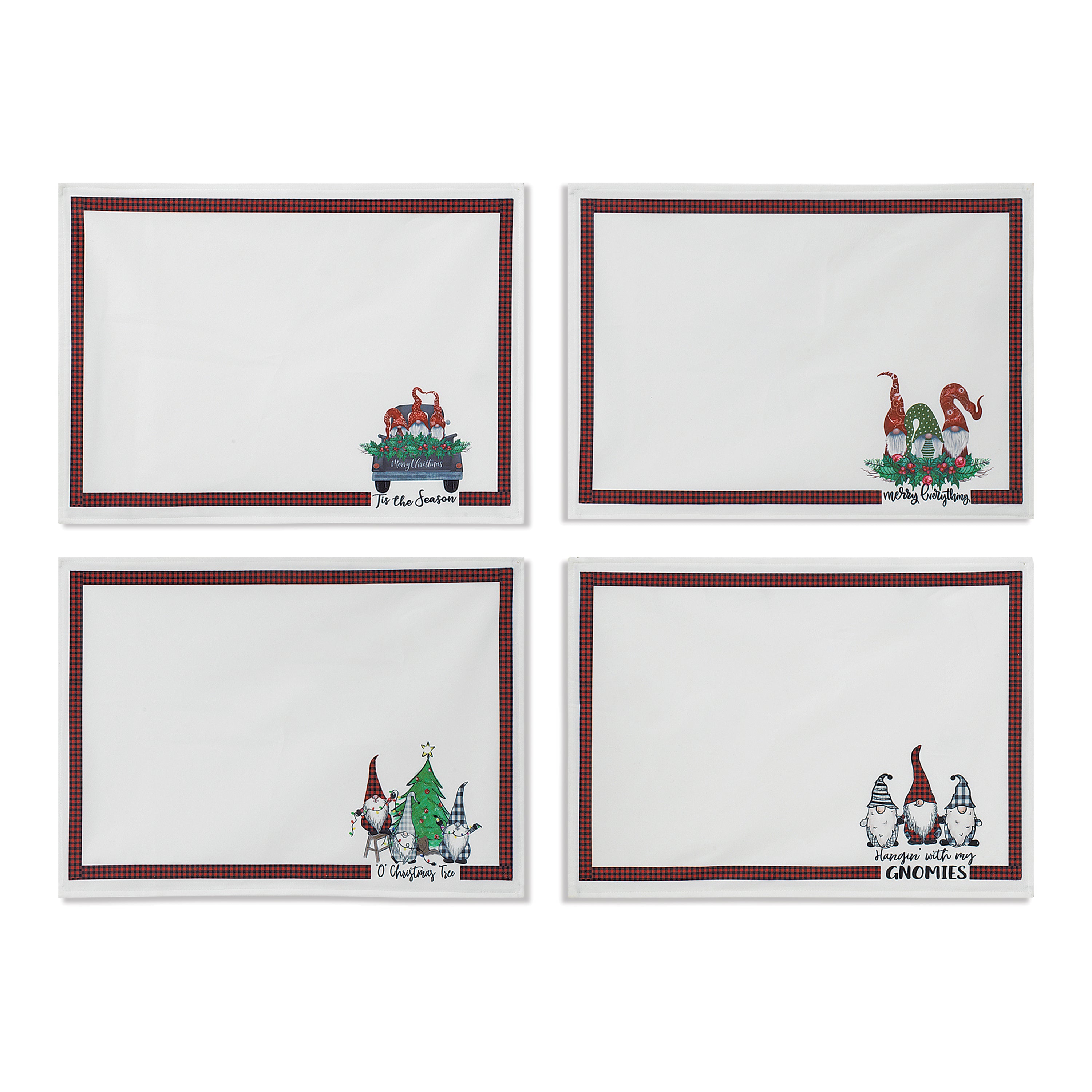 These four 18"L fabric placemats will be a big hit on your holiday table! White w/a buffalo plaid border, each is adorned w/a different holiday Gnome scene on the right bottom corner. / Each place matt has an eye-catching scene of holiday gnomes / Everybody loves gnomes! / These four place mats will add and additional holiday touch to your table / Machine washable on gentle setting / Measures 18"L x 13" W x 0"H / For indoor use only