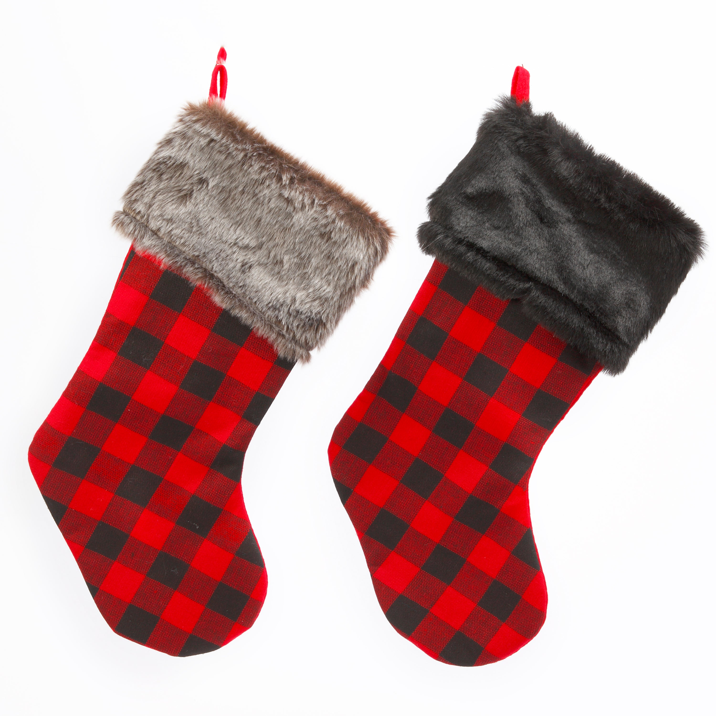 Bring the rugged outdoors inside w/this Set of 4, faux fur trimmed timeless red and black buffalo plaid stocking. These 23"H will look great hanging on your mantel. Two colors faux fir, black and gray. / Set of 4, timeless buffalo plaid stockings / Two colors faux fur trim, black and Gray / This classic combination will be a favorite for years to come / Stockings are large enough to hold lots of Christmas goodies! / Each stocking measures 12"L x 1" W x 23"H / For indoor use only