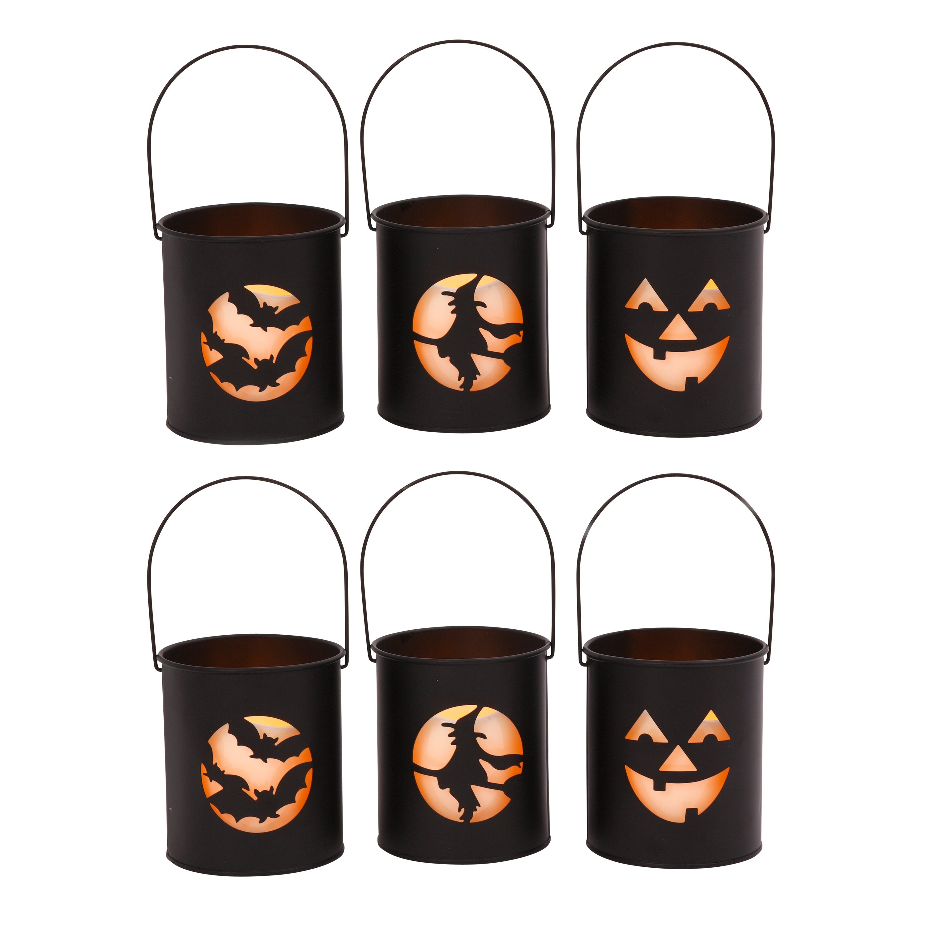 Set of 6, 4.25" Black metal Battery Operated lighted Halloween Cutout Luminaries each w/3"H Battery Operated candle that glows orange to show off the three style Halloween cutouts, w/6 hour timer. Requires 6 AAA batteries, not included. Each measures 3.94"L x 3.74" W x 4.25"H. / Three Battery Operated lighted Halloween styles , jack-o-lantern, witch on broom and flying bats. Each luminary features a black metal handle / You can even separate the set to place a canister in several areas of your home to add a touch of haunting flair to every room! / Each luminary features a black metal handle for hanging if preferred / Features timer that is on 6 hours, off 18 hours. Requires 6AAA batteries, not included / Each measures 3.94"L x 3.74" W x 4.25"H / Indoor/covered patio use