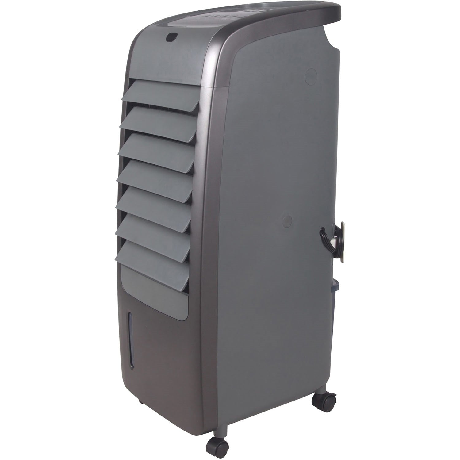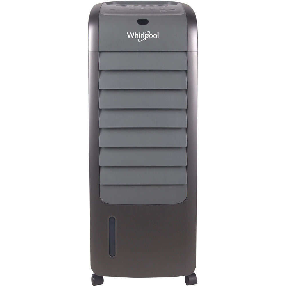 The Whirlpool 155 CFM indoor evaporative air cooler offers an effective, low cost cooling option in areas with dry heat, such as the southwest region of the United States. The low power consumption of a mere 70 watts will save you a noteworthy amount on your energy bill in comparison to the cost of running a standard air conditioner. This unit is designed for indoor use in open environments equipped with cross ventilation up to 428 square feet. Control the operation of your air cooler with ease using the remote control to adjust the function to suit your comfort needs. Three fan speeds and automatic louvers evenly distribute cool air after it is sifted through the filter, providing a fresh, clean breeze throughout your room. Castor wheels and a convenient handle allow for effortless movement between rooms. For those living in more humid climates, consider Whirlpool’s portable air conditioning units or window air conditioners.
