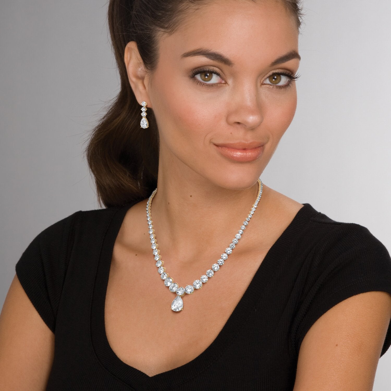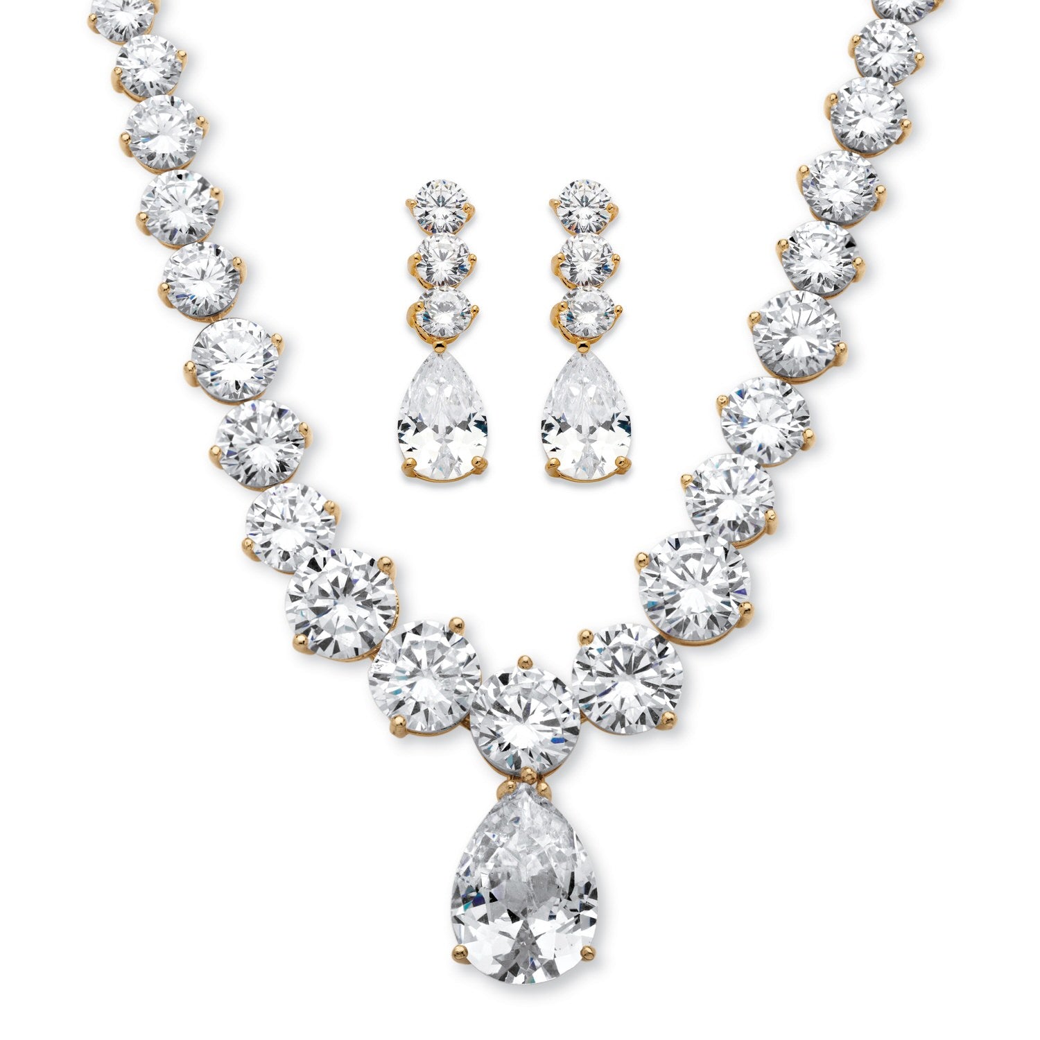 PalmBeach Gold-Plated Pear Cut Graduated Necklace and Earring Set Cubic Zirconia