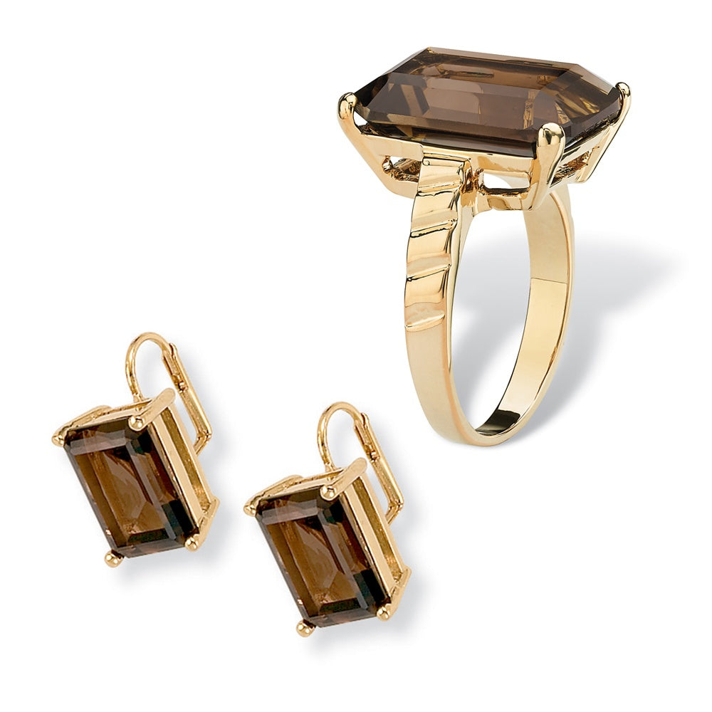 A ring of elegance with its classic design and exquisite color, this 10.75 carat smoky quartz ring features a unique emerald step-cut setting for added sophistication. 14k gold-plated. Sizes 5-10. The smoky quartz earrings are 14.5 carats T.W. (All carat weights are approximate and may vary slightly from those listed.)
