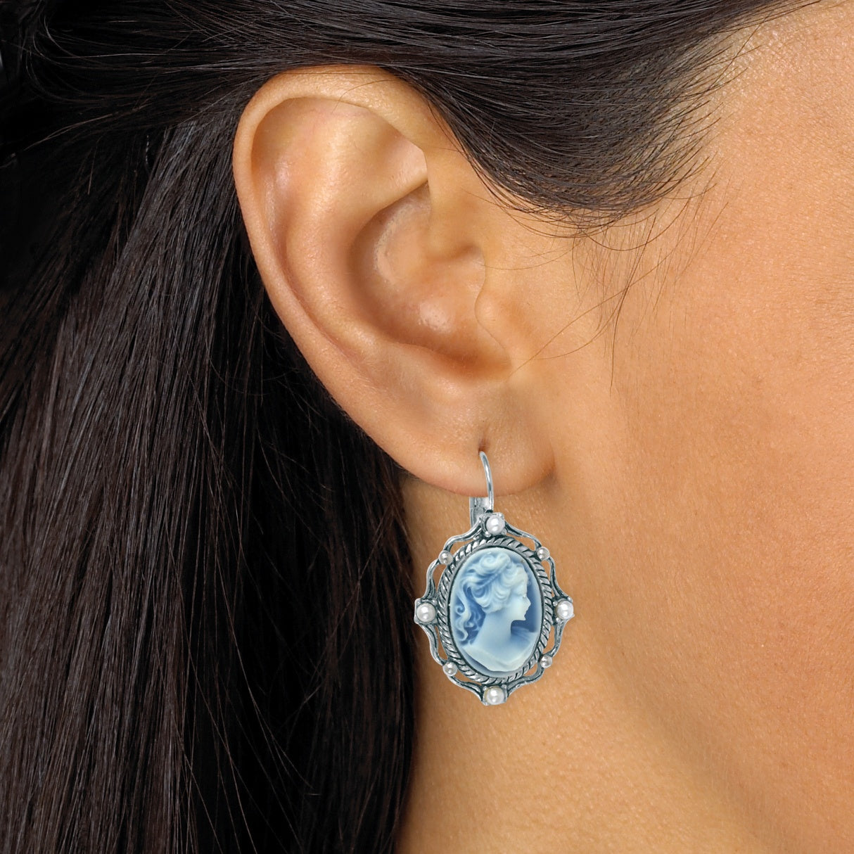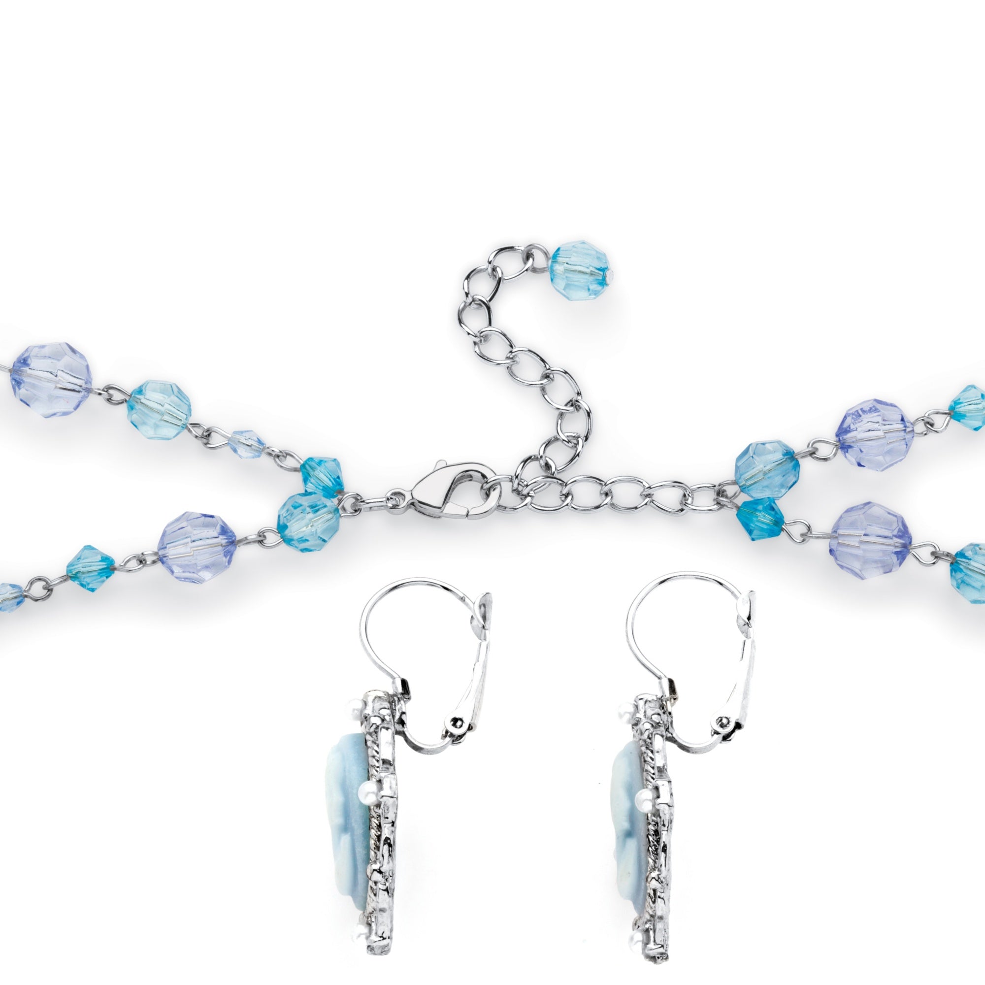 PalmBeach Silver Tone Antiqued Oval Shaped Cameo Lucite and Simulated Pearl, Drop Necklace and Earring Set, 16 inches plus 2 inch extension