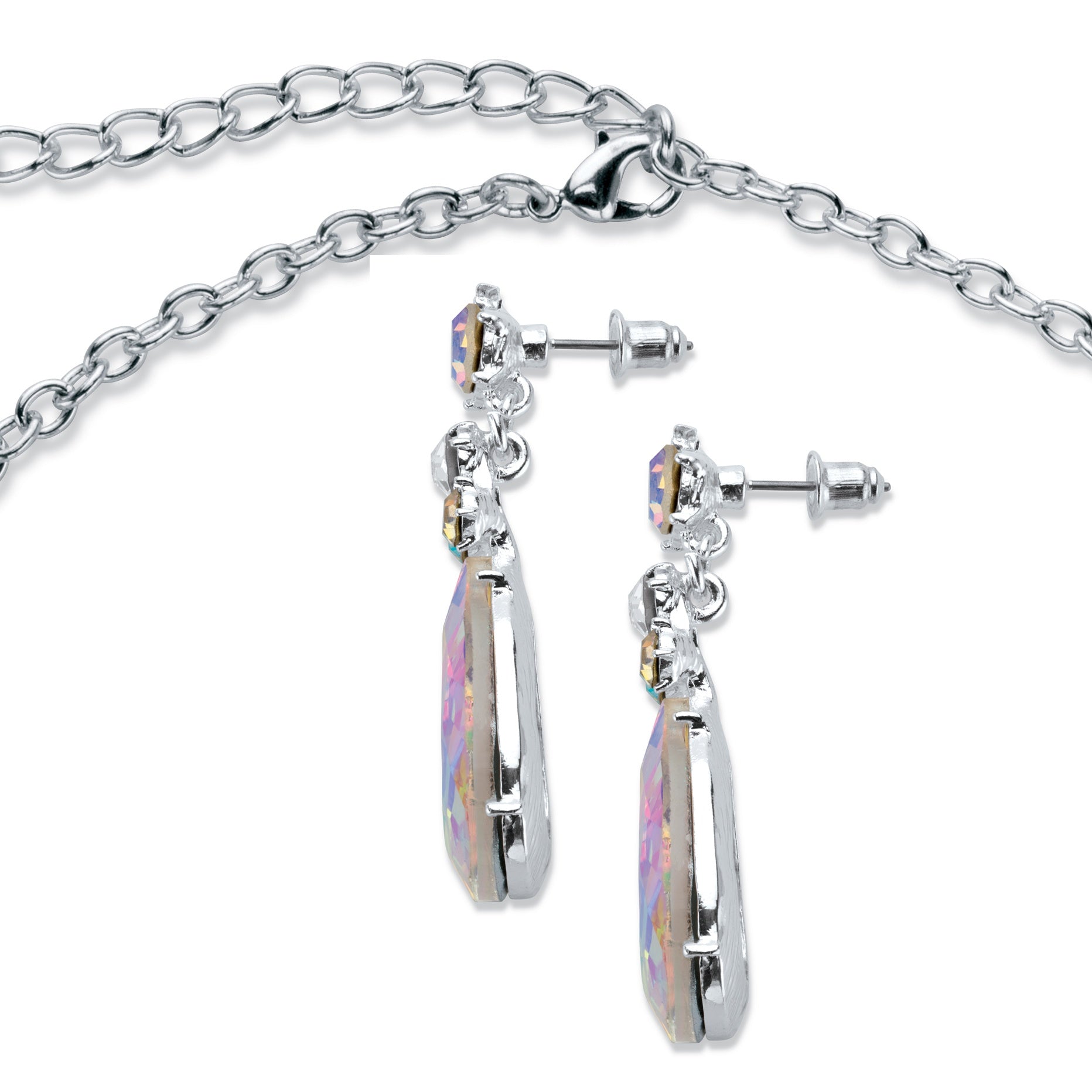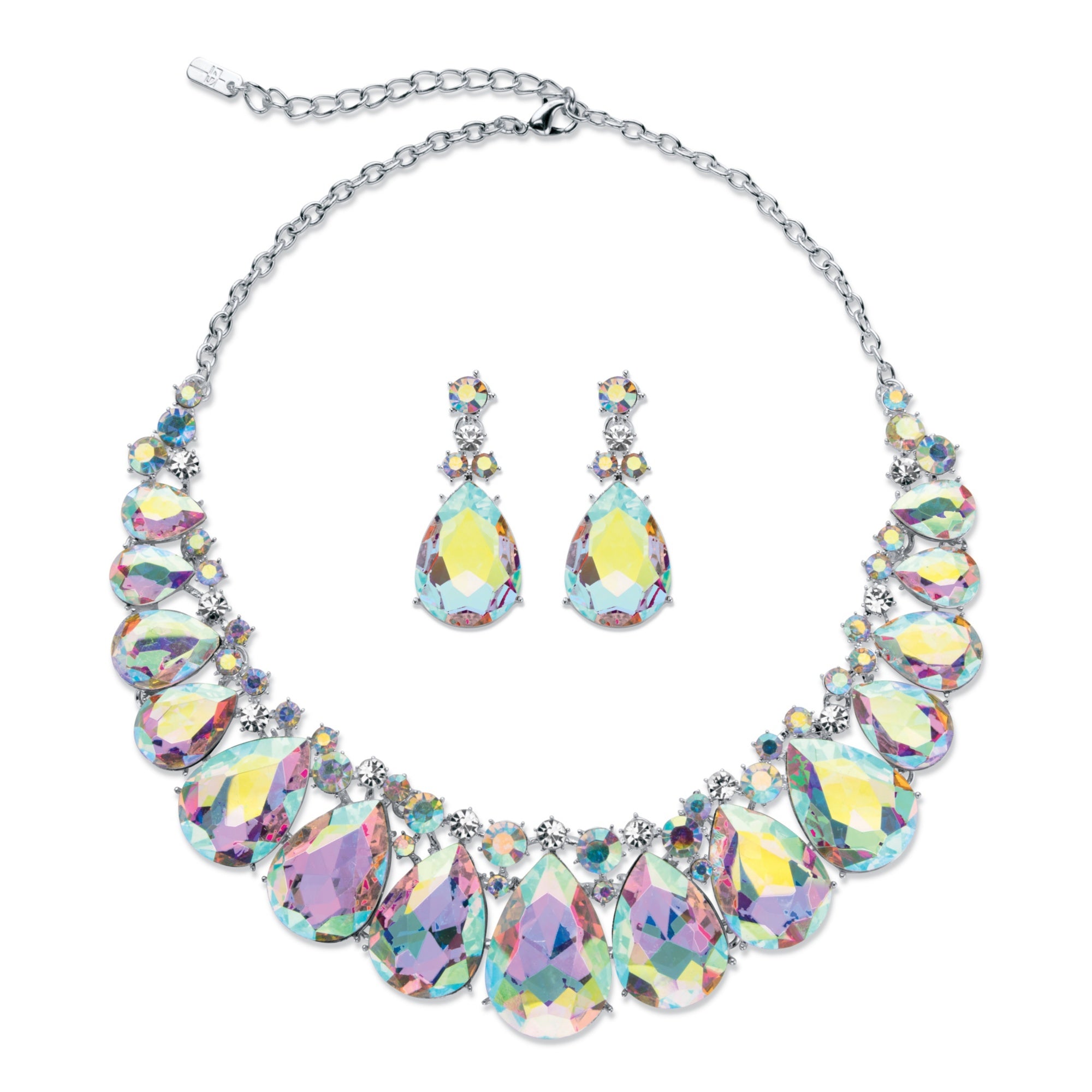Ready for the red carpet or a night out... this aurora borealis crystal set will captivate everyone around you with it's pear-cut bib design drawing all eyes to your neckline. The necklace is 16" length with a 2.5" extension. The matching 1 5/8" drop earrings complete the pretty picture. Silvertone.