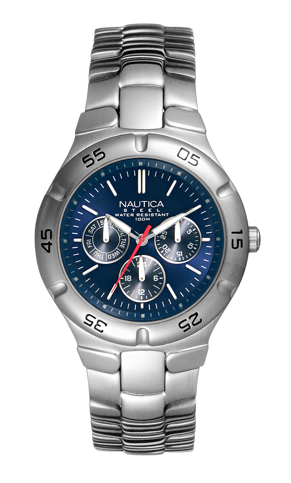 Nautica Mens Steel Sport Bracelet Watch With Day/Date/24 Hour Subdials. Case: Brushed/Polished Stainless Steel. Bracelet/Strap: Brushed/Polished Stainless Steel Adjustable Bracelet With Sport Clasp. Dial: Blue Sunray-Effect Dial With Subdials. Movement: 3 Hand With Day/Date/24 Hour Subdials, Battery Operated Japan Quartz Movement. Crystal: Scratch Resistant Mineral Crystal. Water Resist: 330 Feet. Warranty: 5 Years. Gift Box: Nautica Retail Gift Box Packaging