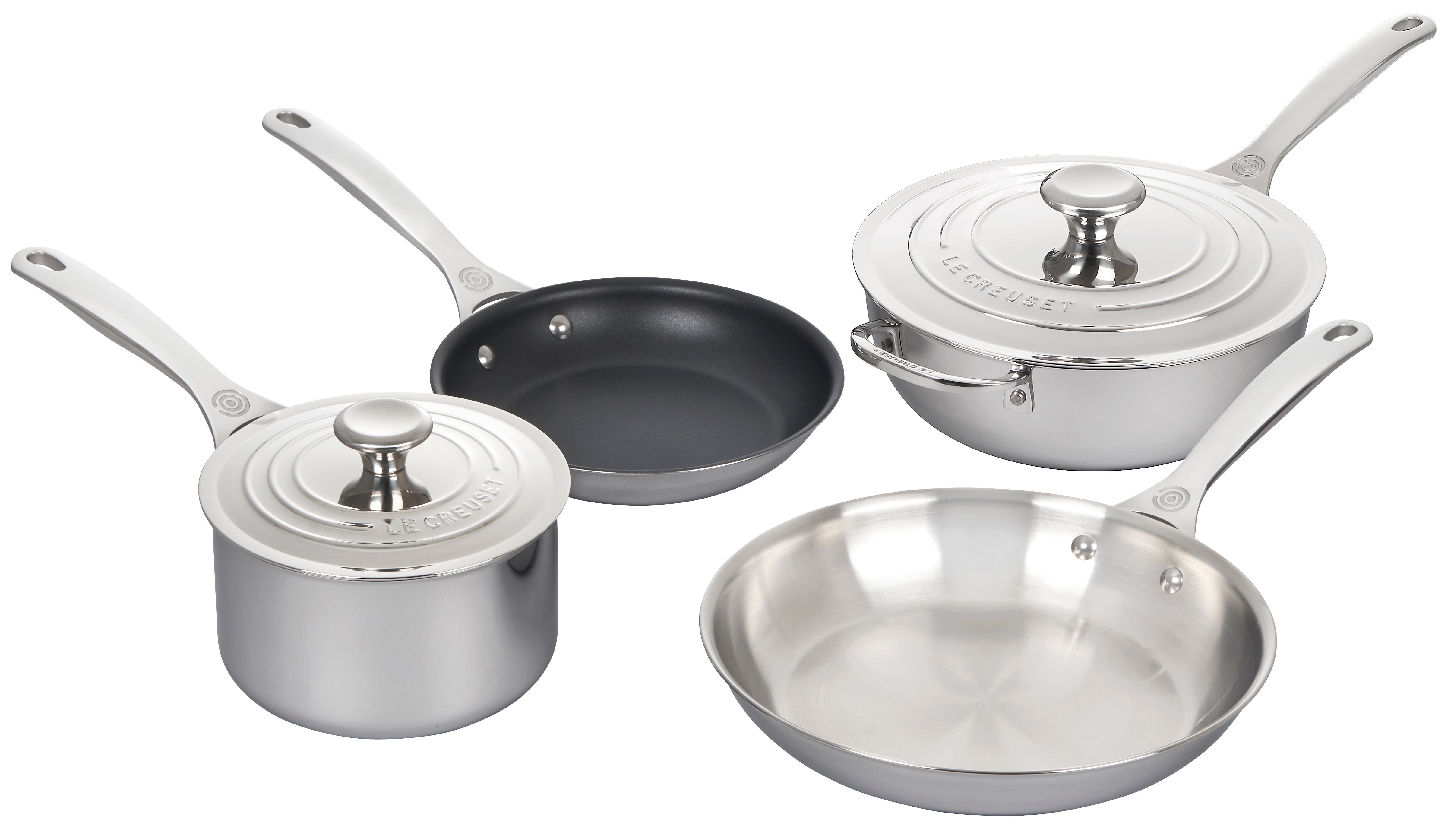 6pc Stainless Steel Cookware SetTriple layer construction with full aluminum core. Superior heat distribution. Exterior resists scorching and corrosion. Three ring lid with stainless knob. Precision pour rim. Stay cool handles and helper handles. Laser etched capacity markings. Compatible on all cooktops, even induction. Oven safe up to 500F. Metal utensil safe. Dishwasher safe. Includes: 8" Nonstick fry pan. 10" Fry pan. 2qt Saucepan with lid. 3.5qt Nonstick saucier pan with lid.