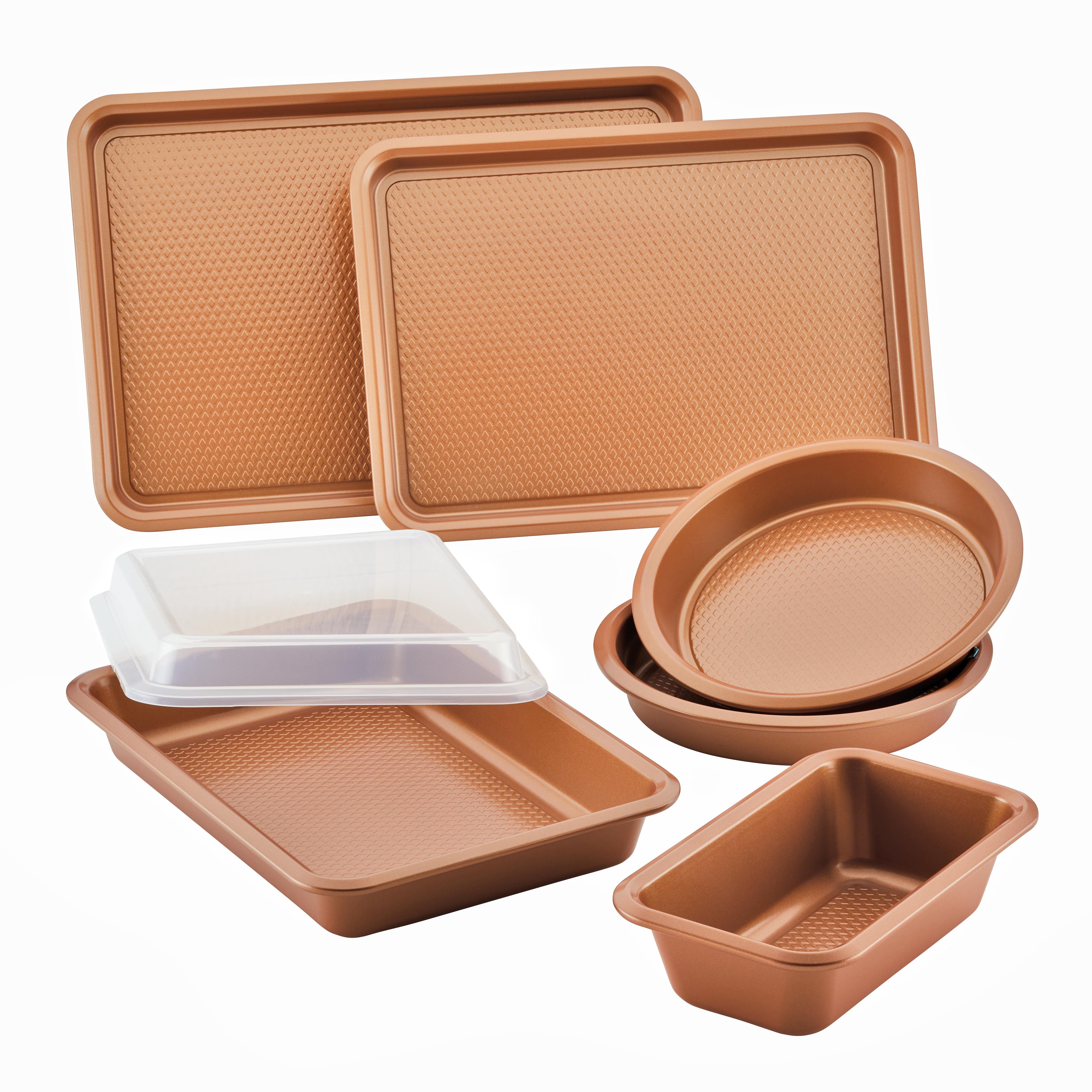 7pc Nonstick Bakeware Set, CopperBring out the best with Ayesha Curry bakeware. Diamond textured nonstick surface supports easy food release and easy to clean. No folds or seams make it easy to clean. No more nonstick sprays that leave residue. Oven safe up to 450F/232C. Dishwasher safe but hand wash recommended for best performance. Plastic lid not dishwasher safe. Includes: Two 10" x 15" Cookie pans. 9" x 13" Cake pan with lid. 9" x 5" Loaf pan. Two 9" Round cake pans.