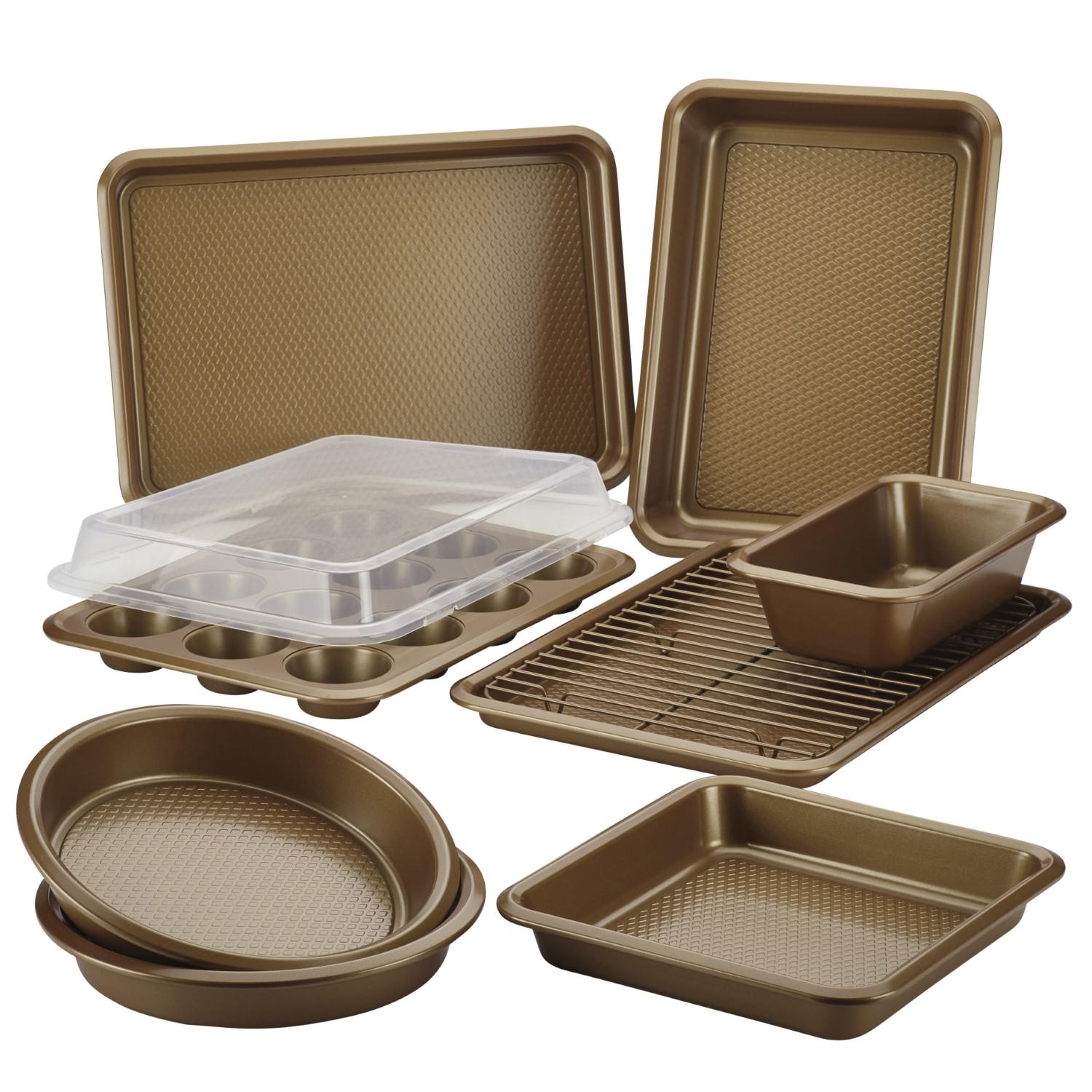 High-performance steel with a stylish copper finish. Diamond textured surface helps to enhance browning. Textured surface features a nonstick finish to easily release food. Rolled edges helps provide an easy grip. Oven safe up to 450F. Dishwasher safe. Ayesha Curry kitchenware supports No Kid Hungry - provides meals to children in need. Includes: Two 9" Round Cake pans. 9" x 9" Square Cake pan. 9" x 5" Loaf pan. 10" x 14" Cooling rack. Two 10" x 15" Cookie pans. 12 Cup Covered Muffin pan. 9" x 13" Cake pan.